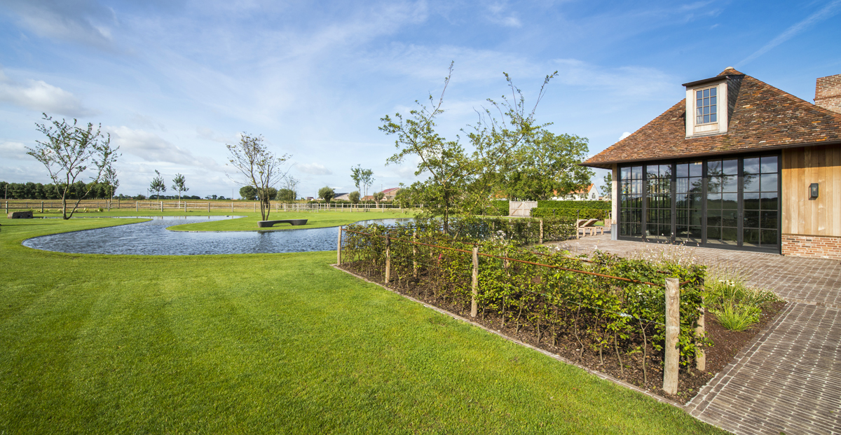 The client, Koen, lives very near to his business at the French border. He longed for a place where he could unwind, with no connections whatsoever to his hatchery business. Landscape architect Berwout Dochy's mission was to design a garden based on this brief. In addition, the garden had to blend seamlessly with the surrounding landscape and accommodate a large pond intended for firefighting.