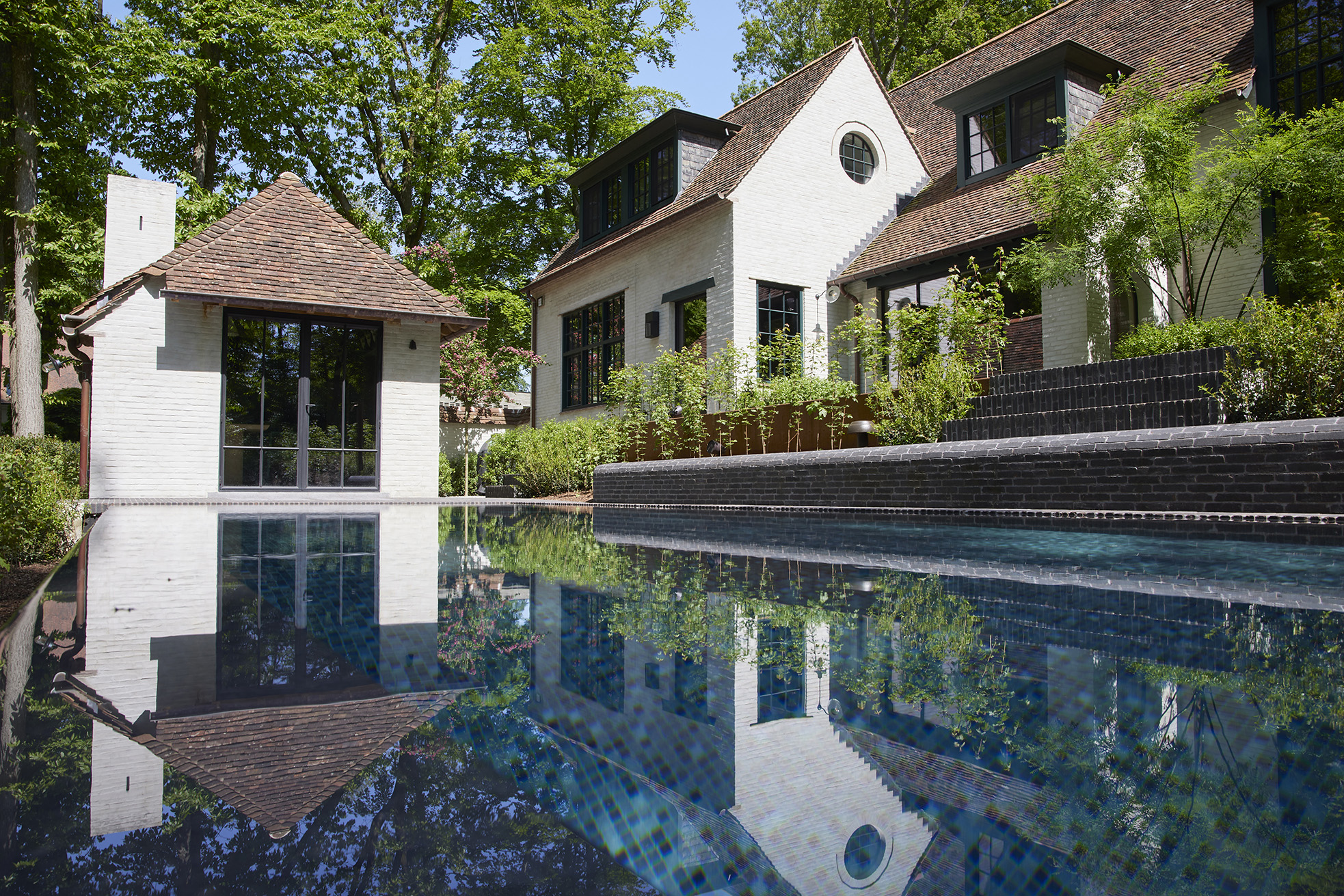 In the picturesque green Sint-Martens-Latem, Belgium, we find a beautiful private garden around a new-build contemporary house, where the clay paver plays a prominent role in the design. This garden, located in a forest area, is an example of how traditional materials such as the Ancienne Belgique Lava clay paver can contribute to a contemporary and sustainable outdoor space.