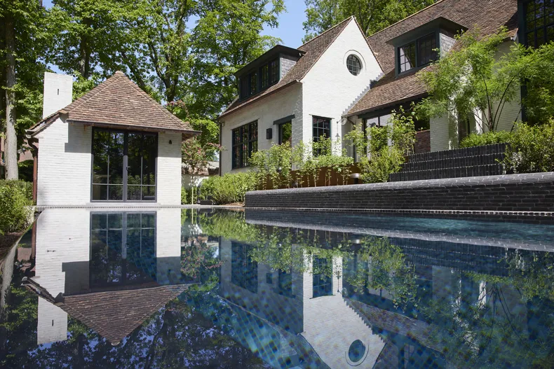 Clay pavers also combine well with other natural materials such as wood, natural stone and gravel. In this garden they create a harmonious whole together with the limewash of the house, the water of the pool and the green topiary. The different shades of the paving stones make it possible to create subtle and aesthetic combinations.