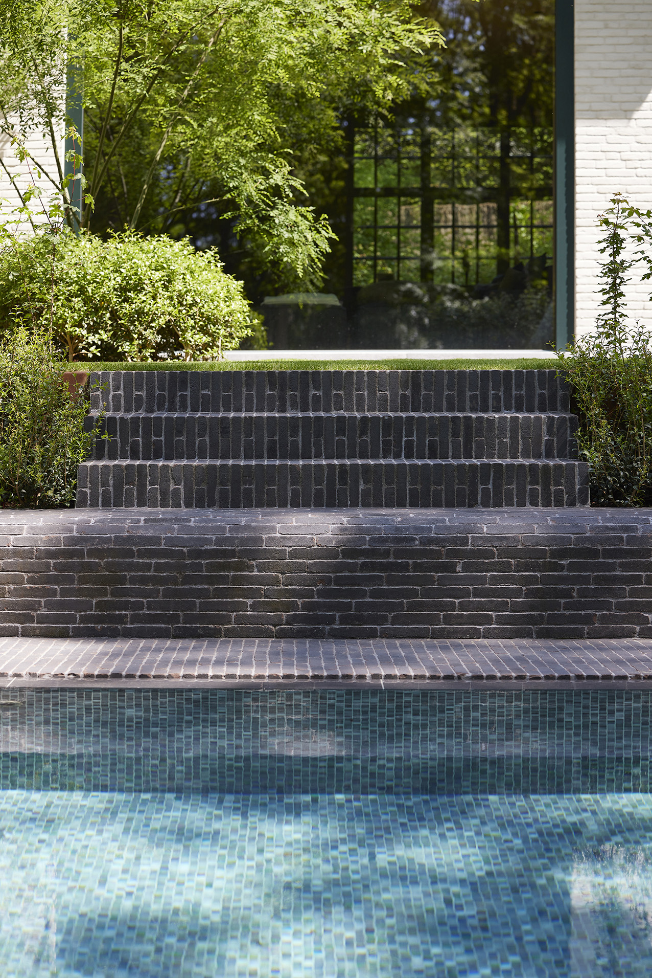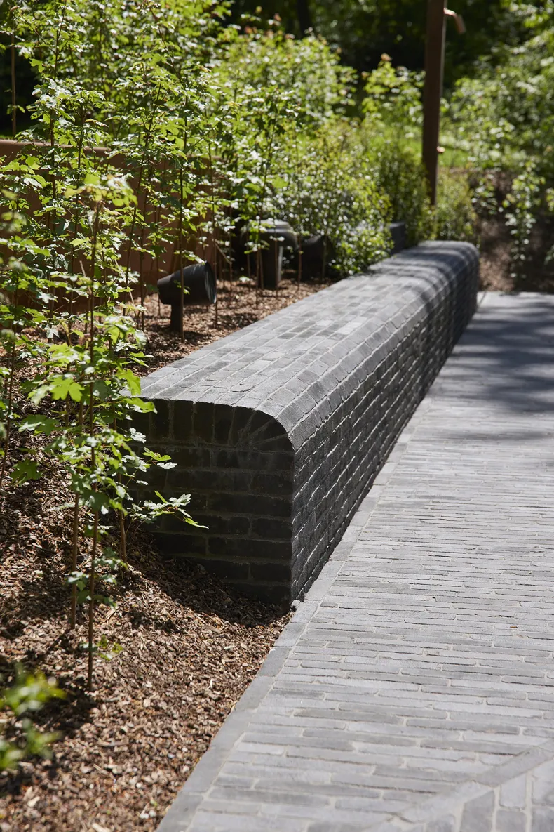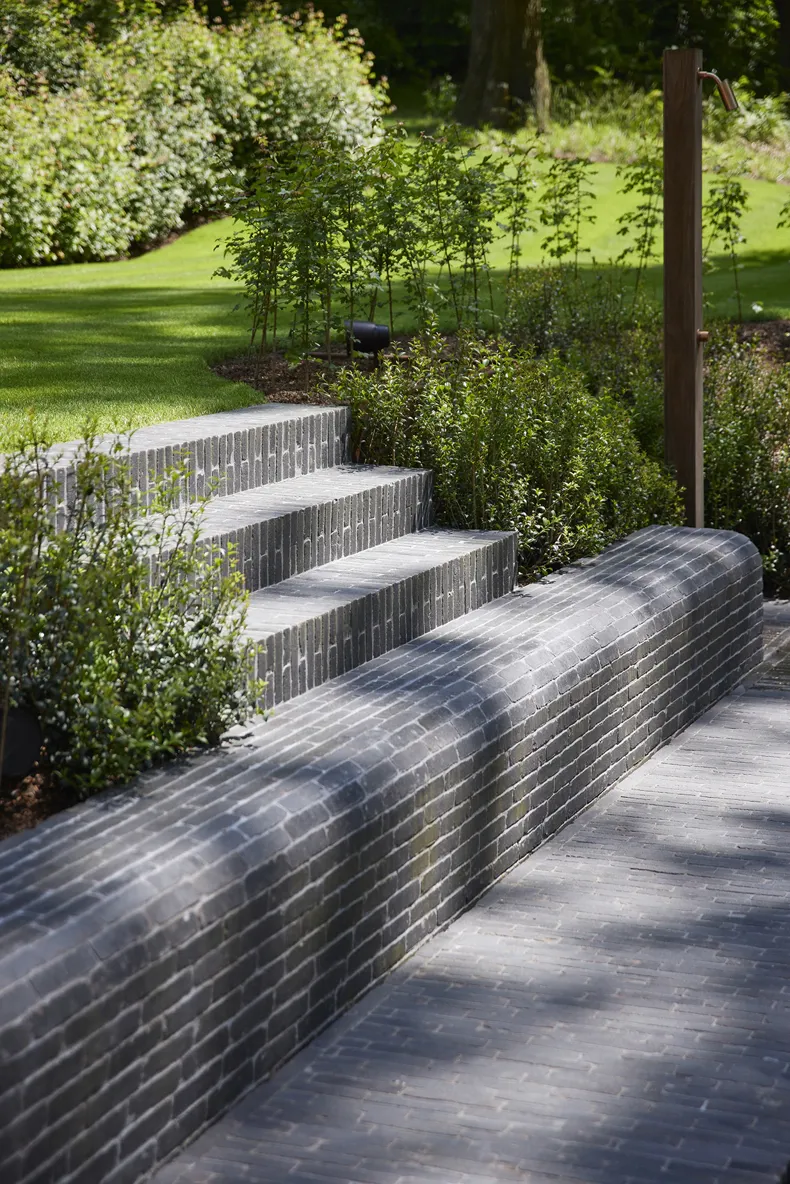 The choice for clay pavers was made because of their natural and sustainable properties. “We have been convinced for a long time and we really like using the baked clay pavers, it is a natural and very sustainable product that will only get better with age”, says Antoine de Brouwer, the landscape architect. They are versatile, for example, in this project they were used for slopes, steps, indoor and outdoor paving, and even for a bench. This emphasises the flexibility and aesthetic advantage of clay pavers.