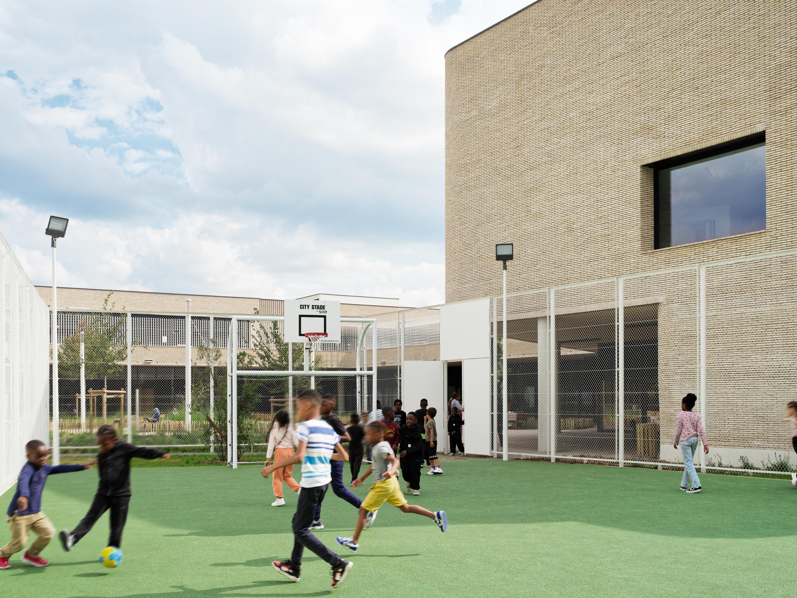 The project includes a nursery school, a primary school, a leisure centre and a cultural centre with a multi-purpose hall, arranged around a central green courtyard. This layout allows for a fluid cohabitation of uses and clear, open access for users. “The public facility is made up of two buildings: the nursery school to the east, and the primary schools to the west, which makes it easier for children to identify with their school during their school career”, explains the architect. The project seeks to open up the site by creating strong pedestrian and visual links to the surrounding streets. The buildings are organised around interior courtyards, providing breathing space for children and residents alike. “The playground, on the same level as the town, is designed as a real urban oasis and a potential square for residents. It is home to individual and group games, a planted amphitheatre and a shaded terrace for picnics outside.”