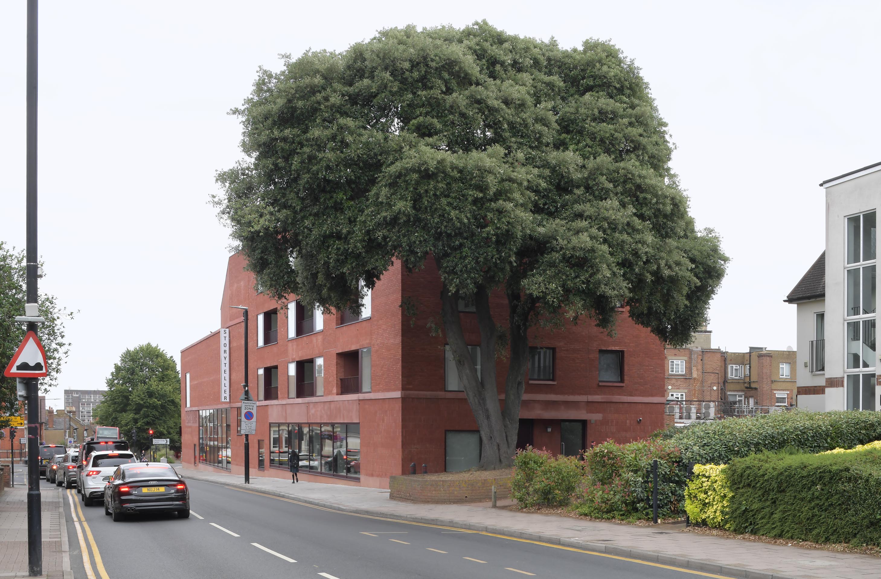Occupying a highly constrained plot—just 11 metres wide and 68 metres long—Sidcup Storyteller acts as a hinge at a key crossroads within the town centre. Its carefully resolved massing and nuanced geometry address the urban setting with sensitivity and clarity. The building combines a ground-floor library and café with co-working spaces, a suite of three cinema screens, and community facilities on the upper levels. Above, nine residential apartments provide cross-funding for the civic functions, while their presence contributes to the building’s urban continuity.