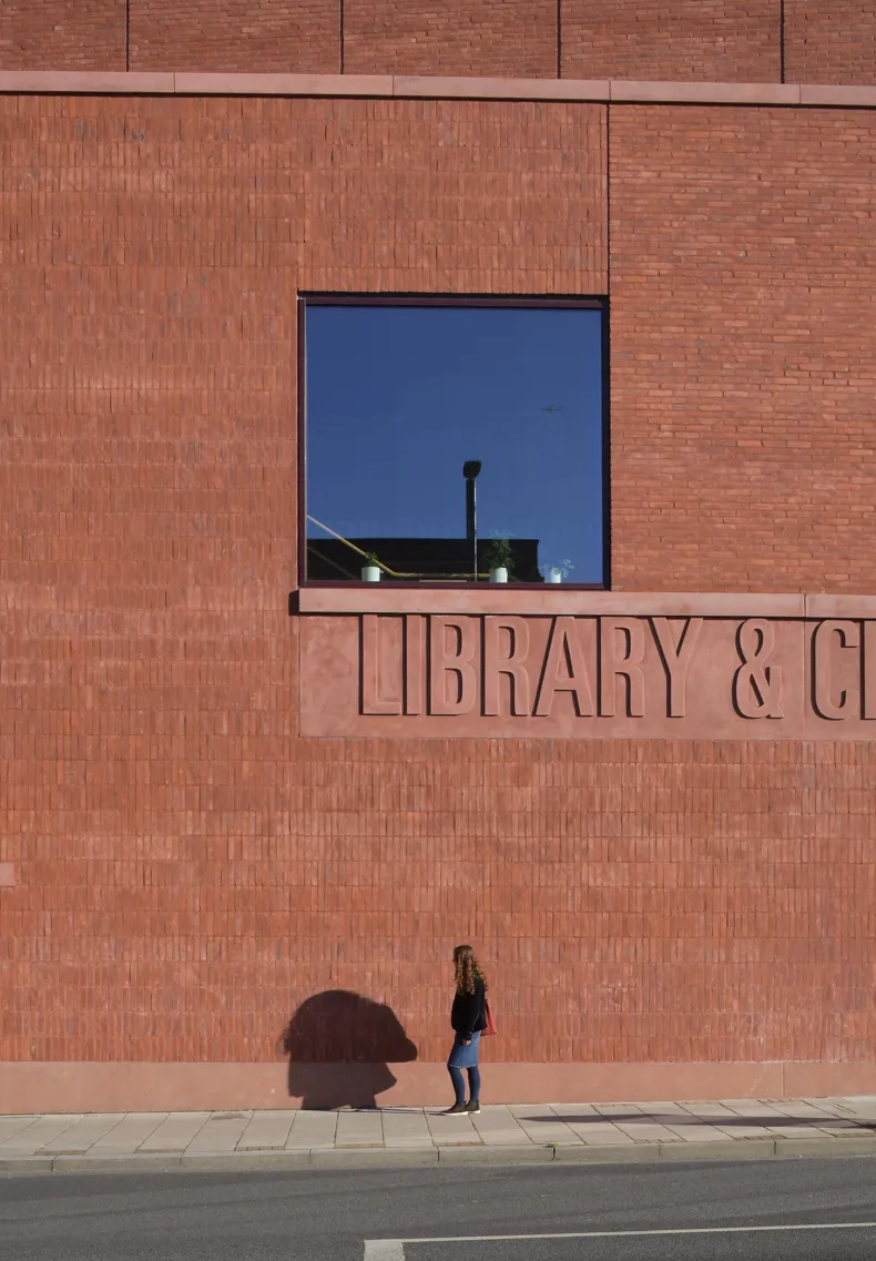 At street level, the building is designed to invite public engagement. The café and library open directly onto the pavement through generous glazed openings, while a recessed entrance within a cylindrical drum gives the building a recognisable civic presence. A glazed, tower-like gable facing the high street echoes the cinematic heritage of the area, referencing the art deco cinema that once stood opposite.