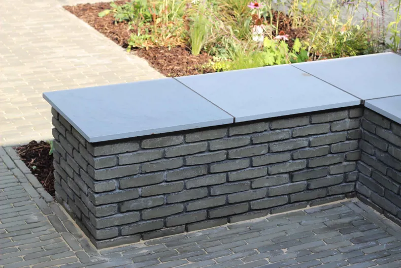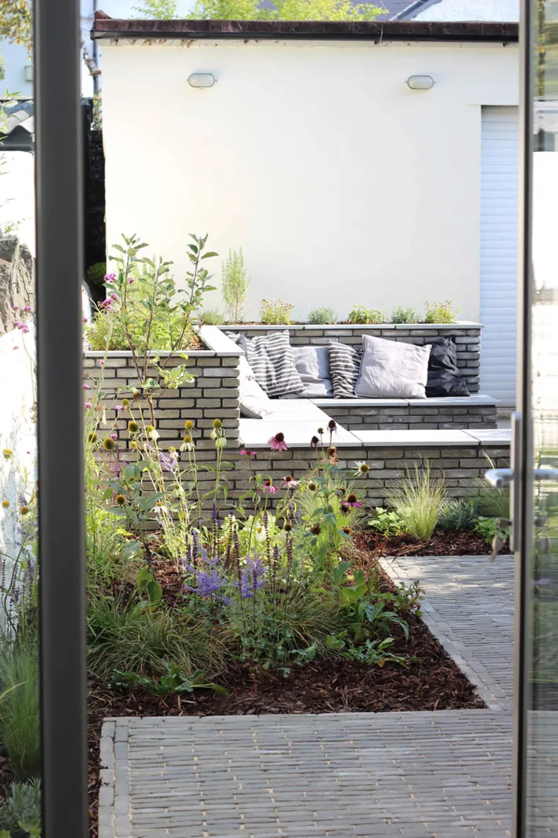 Vande Moortel's Ancienne Belgique Pearl Grey natural clay pavers were used for both the hard surfaces and the walls of the raised beds and built in seating area, which were topped with polished grey sandstone.