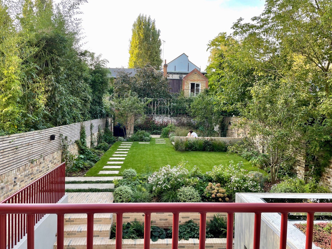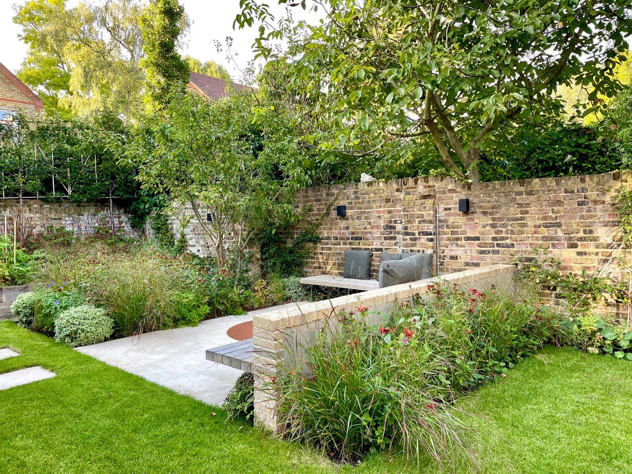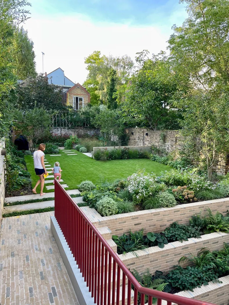 The clay pavers were used for the steps and across both the lower and upper patios adjacent to the house, creating a cohesive transition between different levels. The tiered planting beds were clad with the same clay pavers, enhancing the continuity of materials. A mid-garden wall, paired with an existing boundary wall, supports a bespoke deep L-shaped hardwood bench. The sandstone terrace, which is partially enclosed by the L-shaped bench, provides a comfortable seating area. At its center, a steel fire pit with an integrated cover ensures the space remains functional even when the fire pit is not in use. To screen the garden from neighboring properties, the designer chose to integrate pleached ornamental pear trees at the rear. On the left-hand boundary wall, trellising offers additional privacy and echoes the vertical bands of the red steel railings near the house.