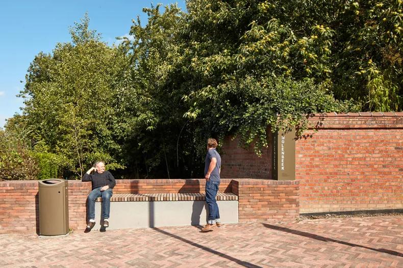 The choice of clay pavers enhances the town, giving it a warm and spacious feel, and makes it clear that the residential function takes precedence over the traffic function. The material fits in perfectly with the brick façades in a variety of colours. The natural colour variation of the clay pavers breaks up the scale and softens the view. The choice of street furniture and detail design was also intended to create a human scale and a homely atmosphere.