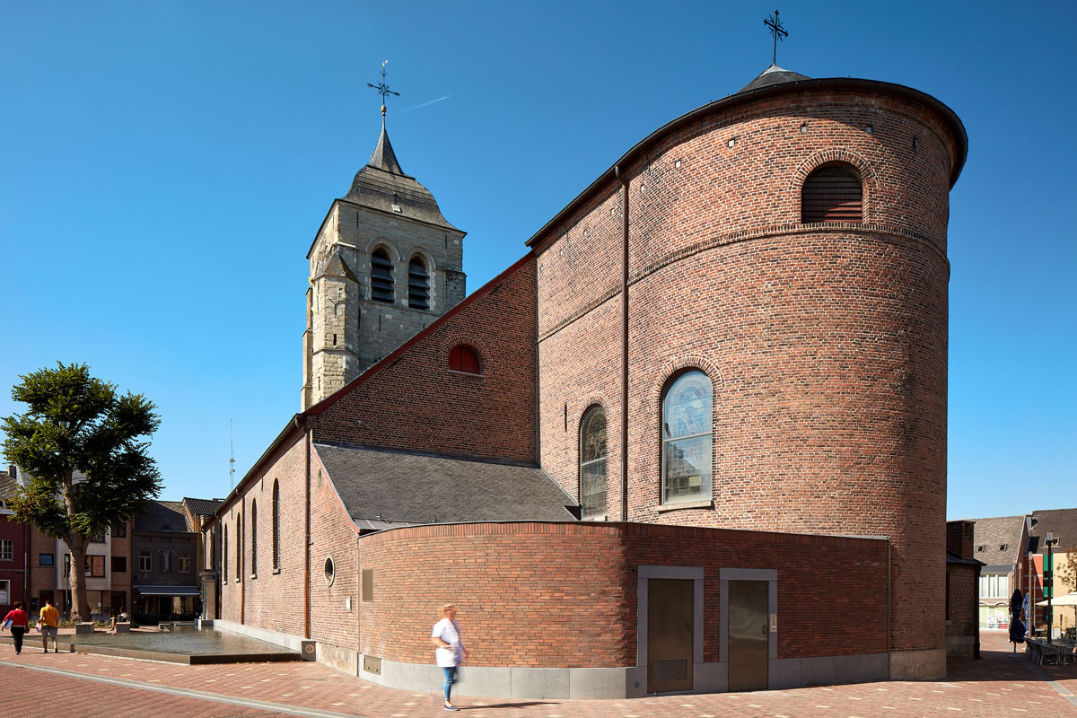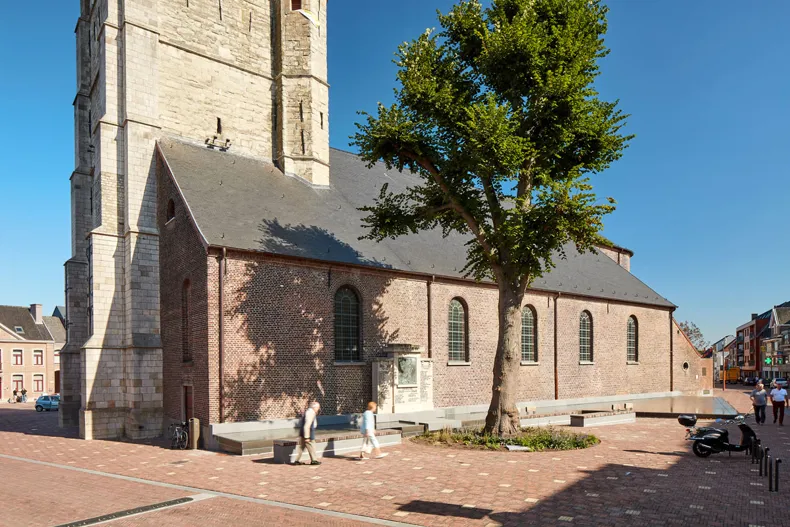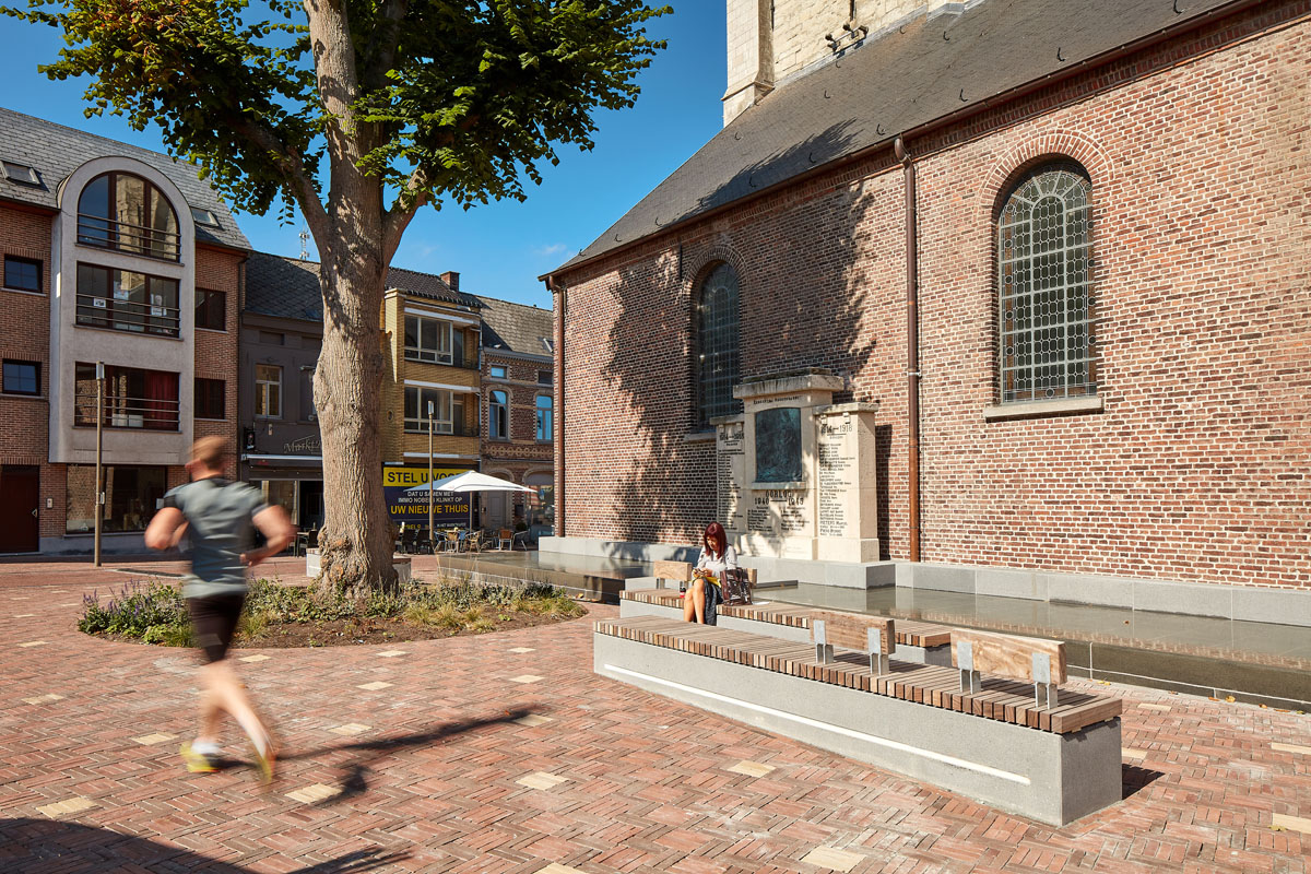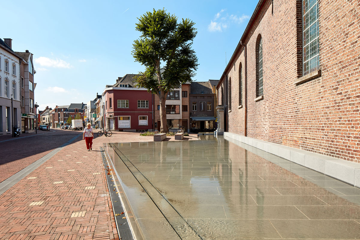 A water feature with fountains around the church serves as a spirit level, highlighting the height difference between the town centre street on the crest of the hill and the river valley. On the street side, this becomes a body of water at pavement level which reflects the church and is accessible for children to play in. Together with Oude Lindeboom, the monument to the town’s war veterans and a number of benches, this creates a unique space.