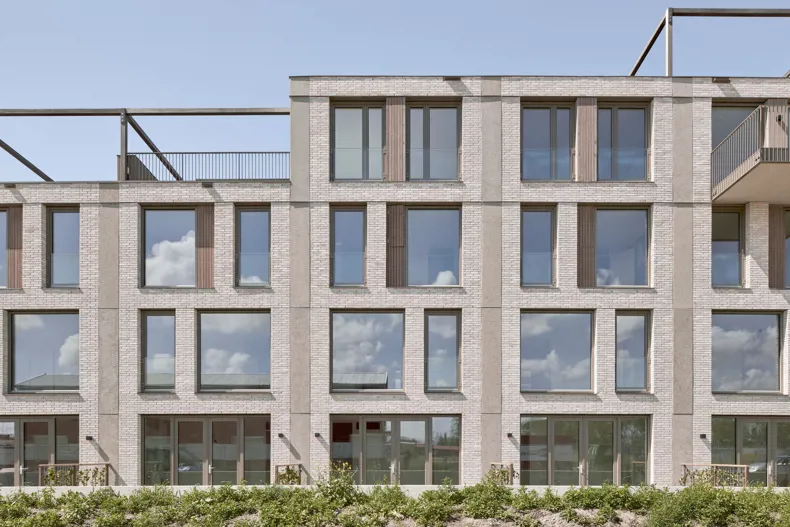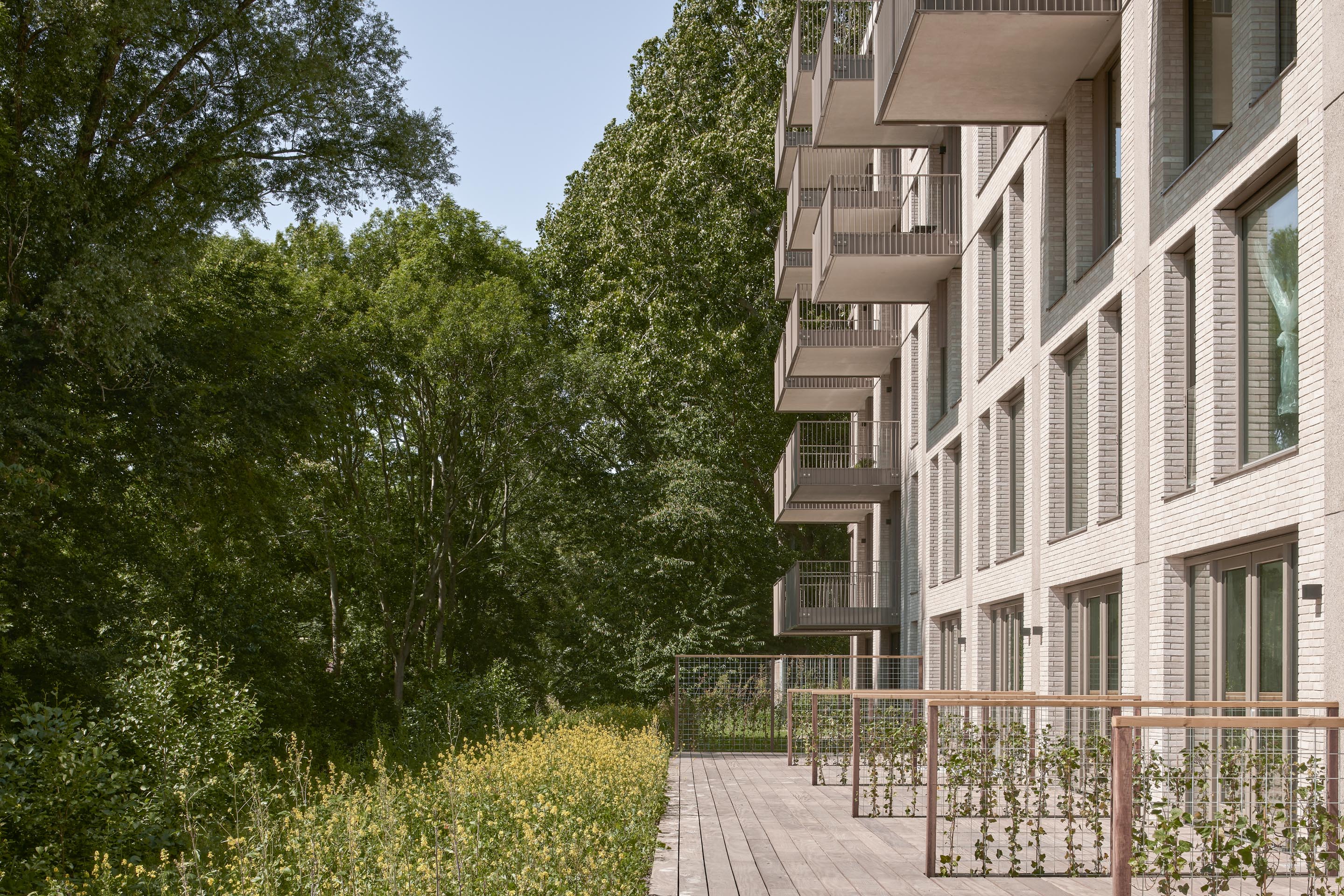 Leyhof’s architecture is modest, but rich in detail. A tiered design was deliberately chosen, in order to get the best possible lighting (higher on the forest side and descending towards the park), oriented towards the sun for all homes and an inviting appearance. The homes are built out of a balanced palette of materials: prefab concrete, wooden façade parts and a characteristic, light-coloured facing brick. This brick, coming from Vande Moortel, has a central role in the overall view of the project.