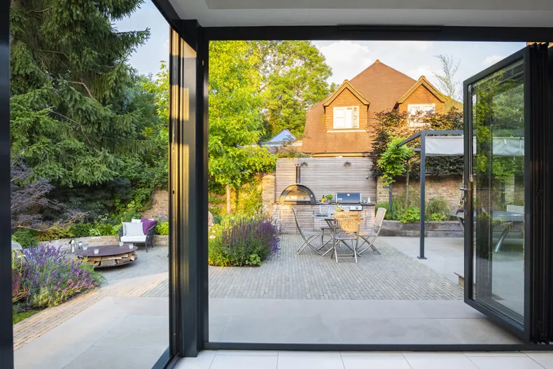 This instantly made the gardens existing planting feel more consistent and established a connection with the newly landscaped area and planting. We designed and built a bespoke kitchen unit, re-designed the sunken fire pit space and a dining area which forms a focal point from the interior glass walls with matching Iroko feature privacy screen and kitchen cladding updating to the brick wall. The 3rd area hides a big practical storage shed and accommodates a pergola with retractable awning with a table tennis beneath. This is a flexible space that can be adapted in the future should our clients need to."