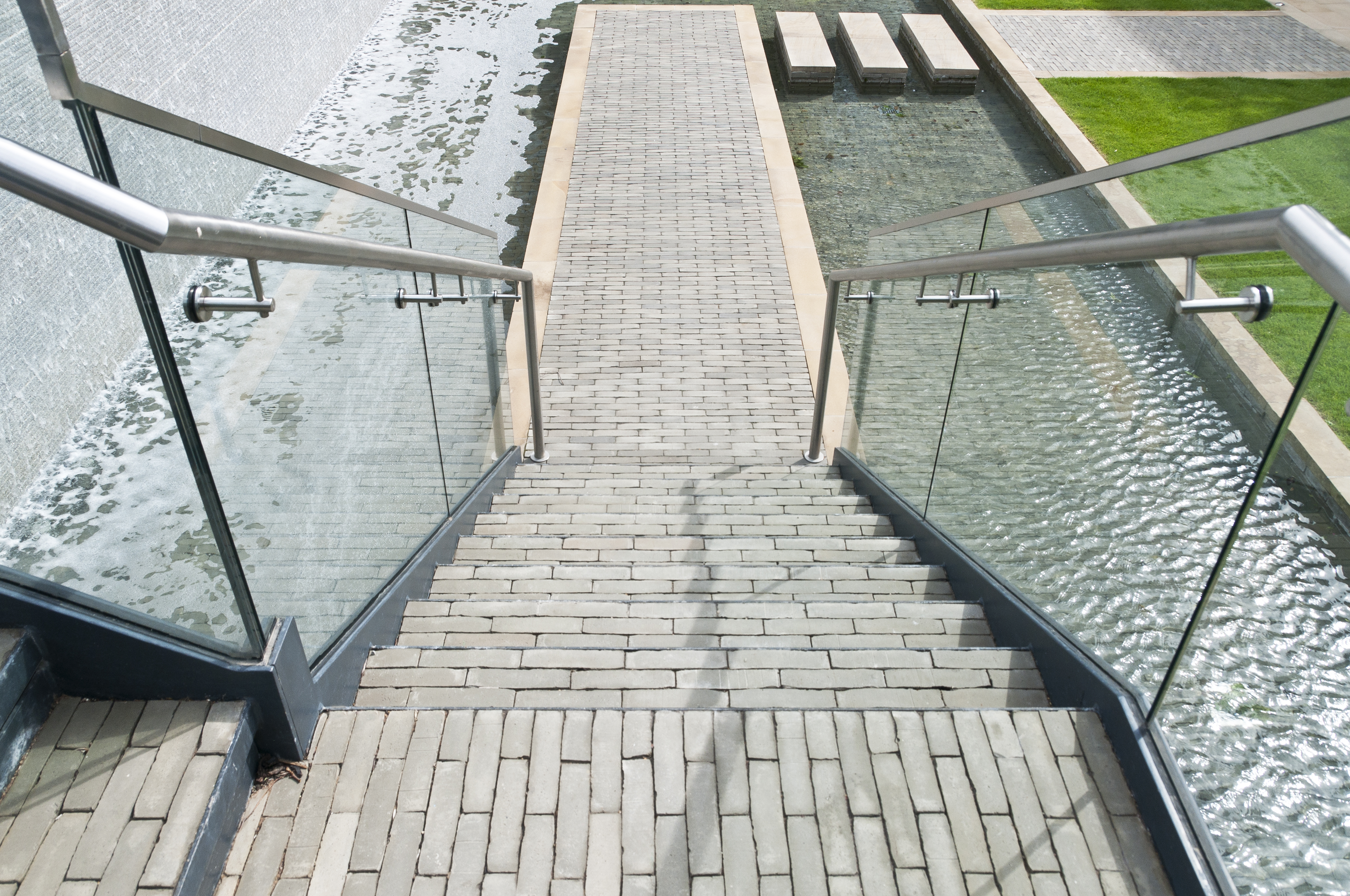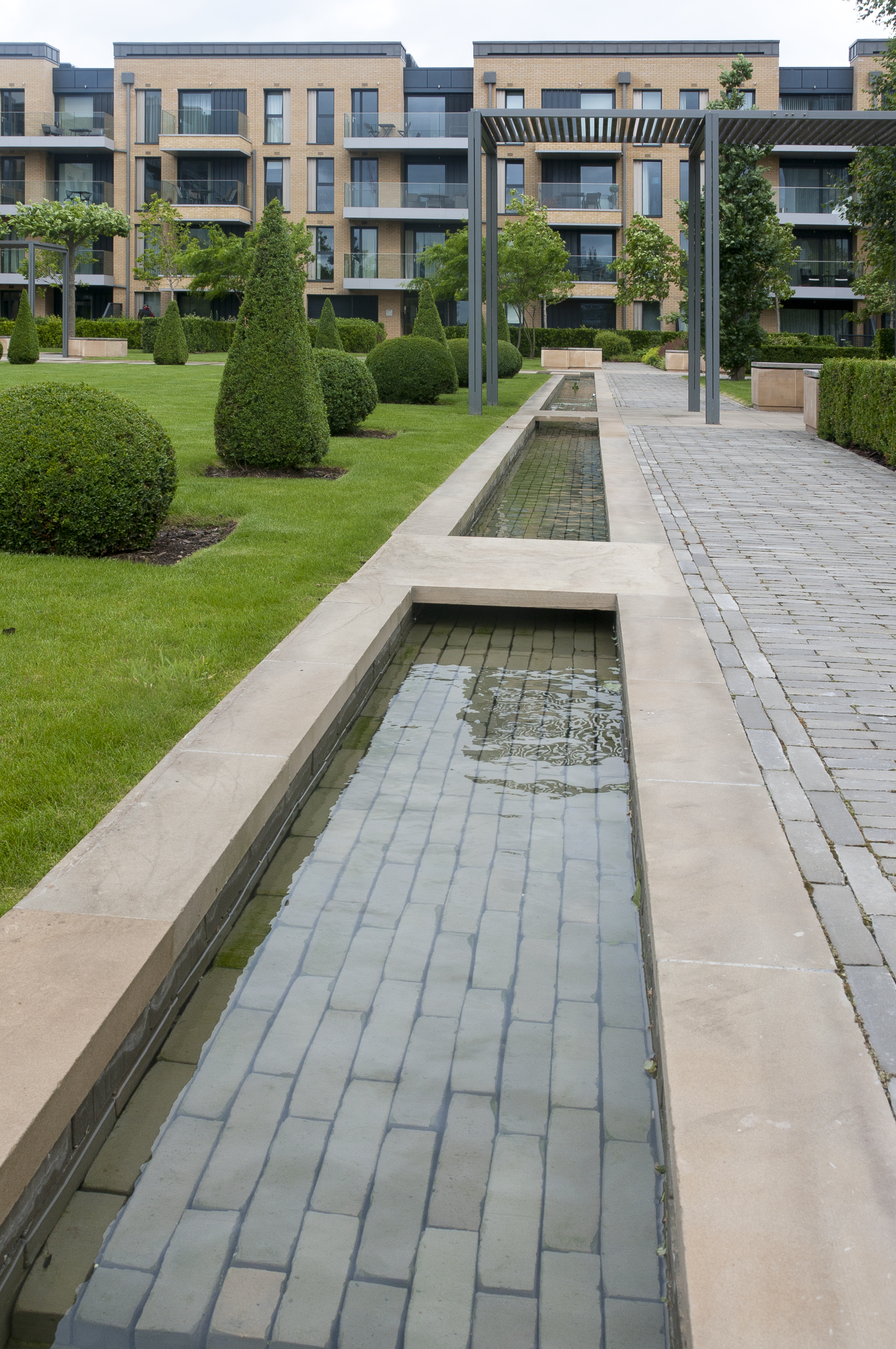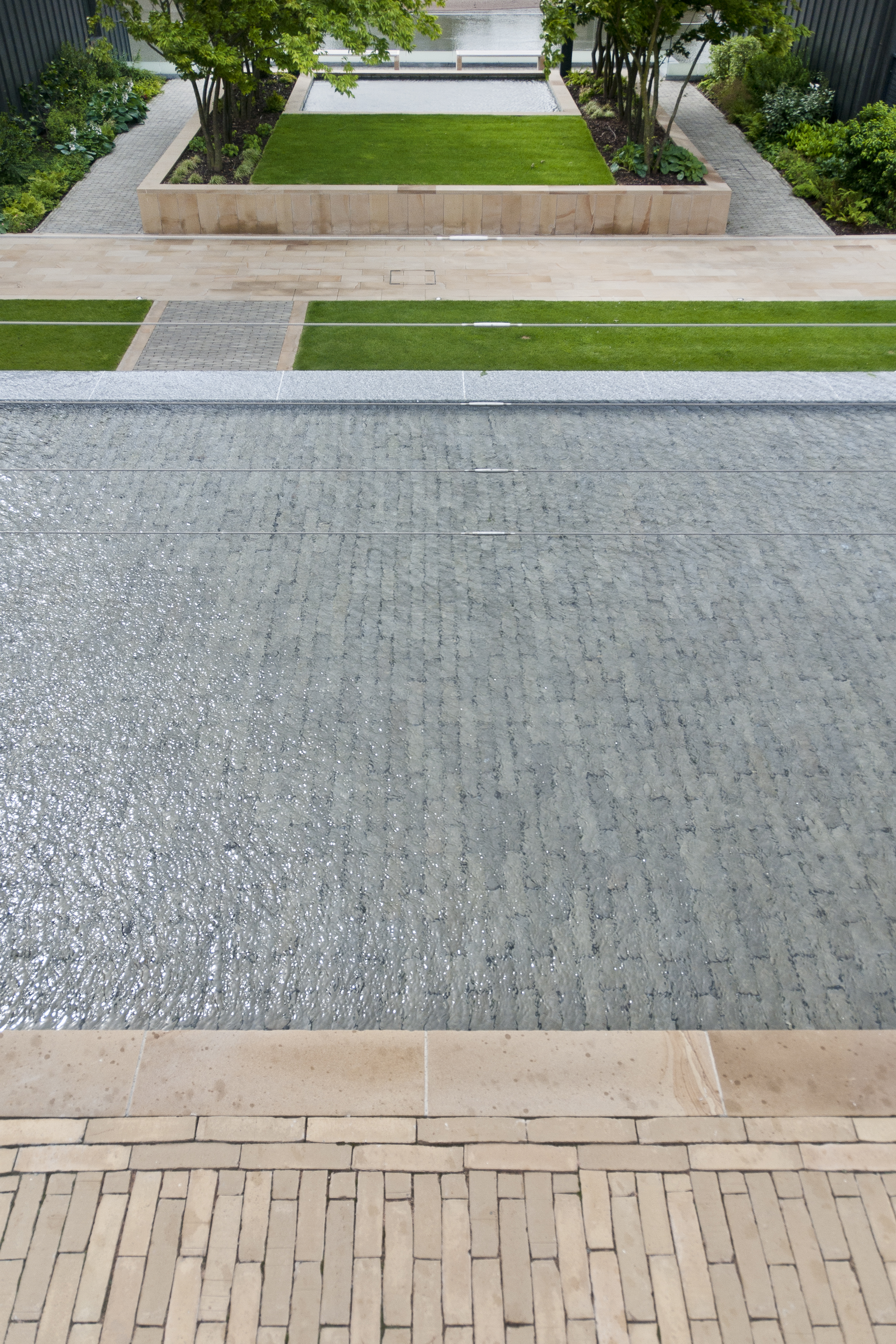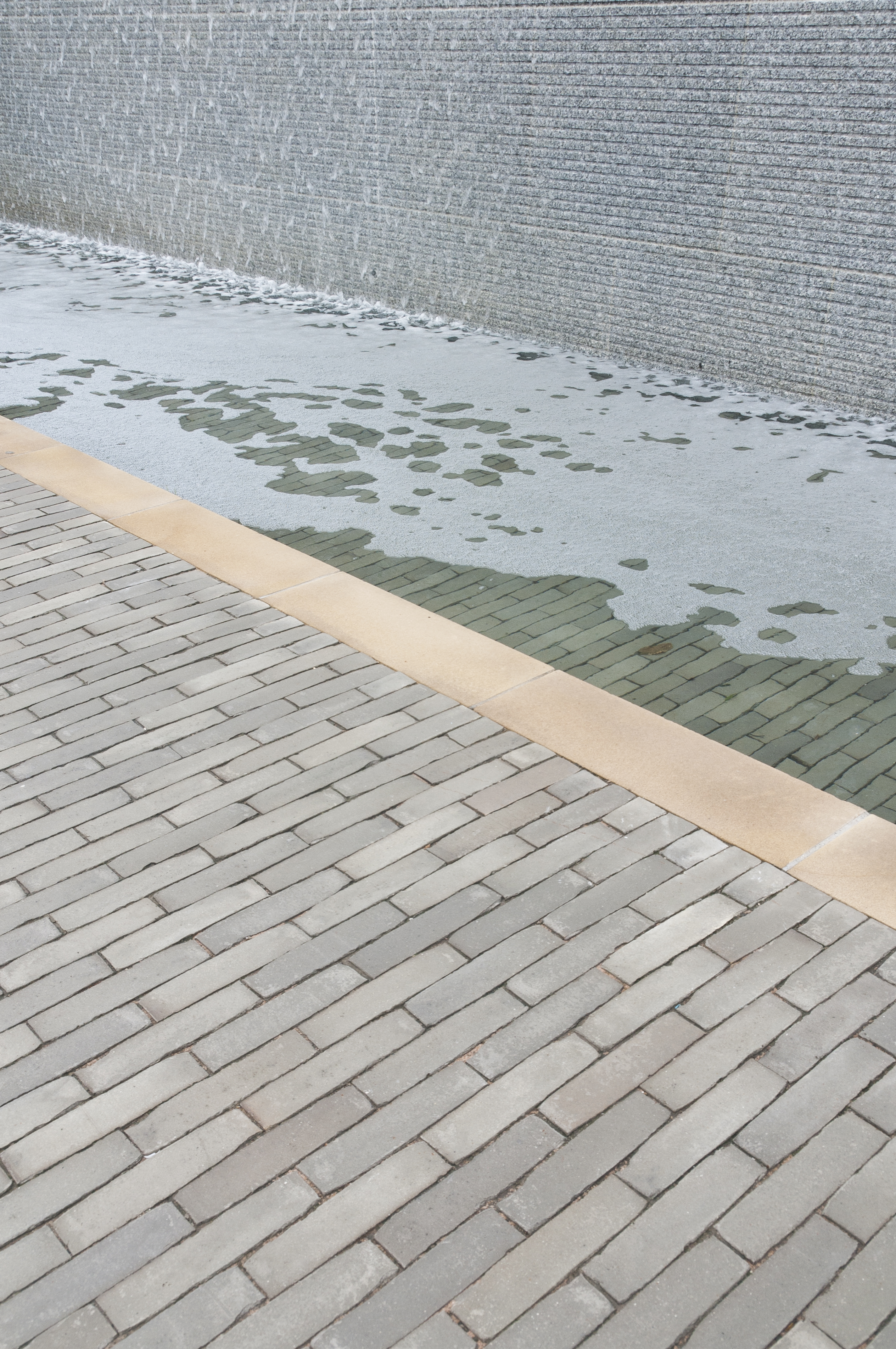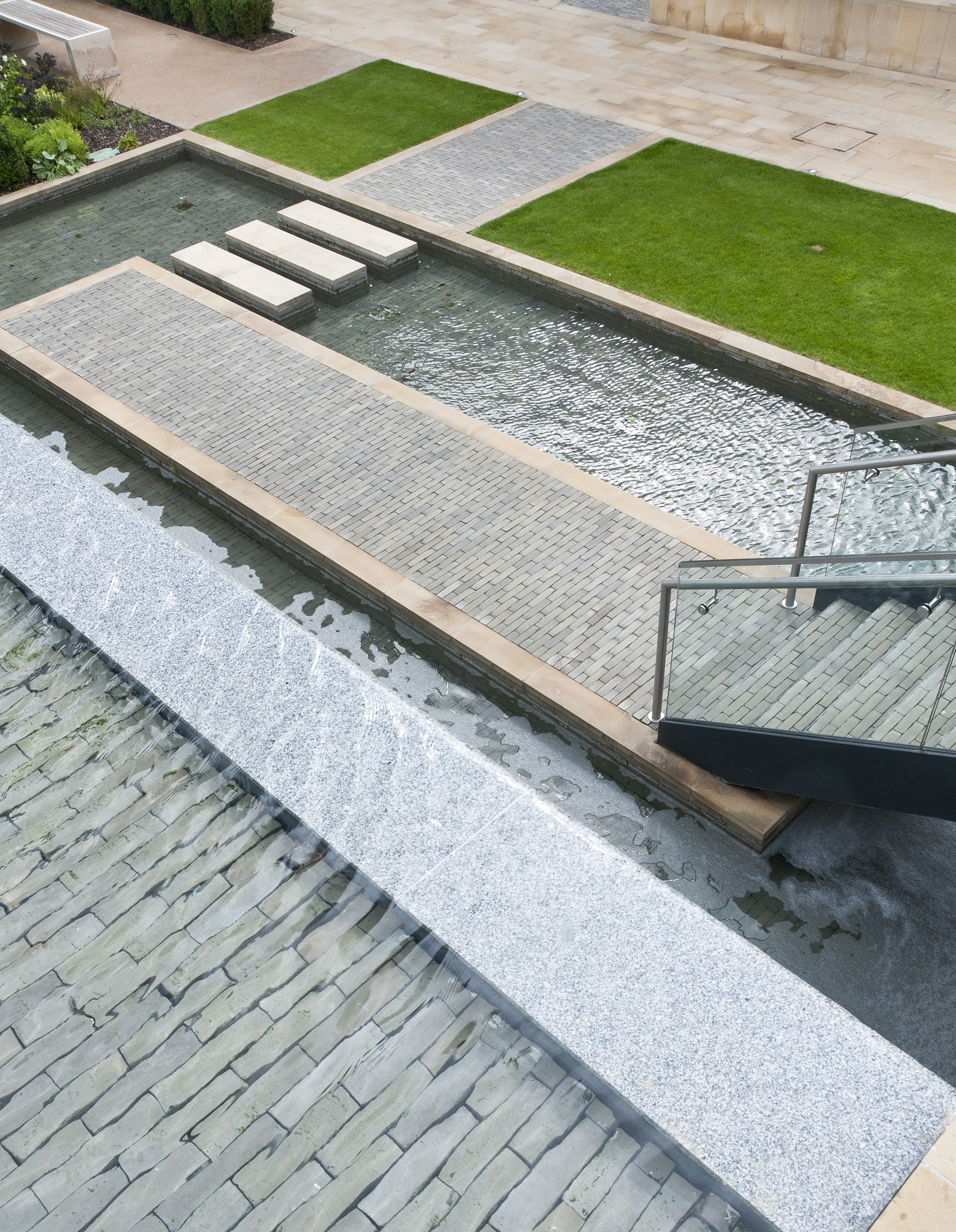 Providing a connection between the clay pavers and the surrounding paths was an extremely important criterion when designing the water features. The texture also provides visual interest and emphasises the movement of the water.