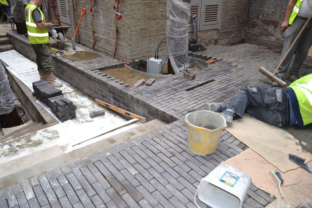 The pavers were close-jointed with mortar and were also used as brick risers to the steps between the varying levels of the paved area.