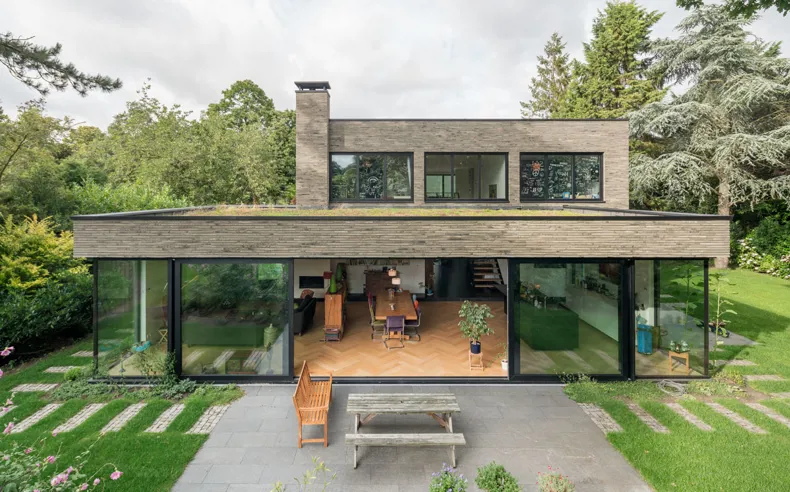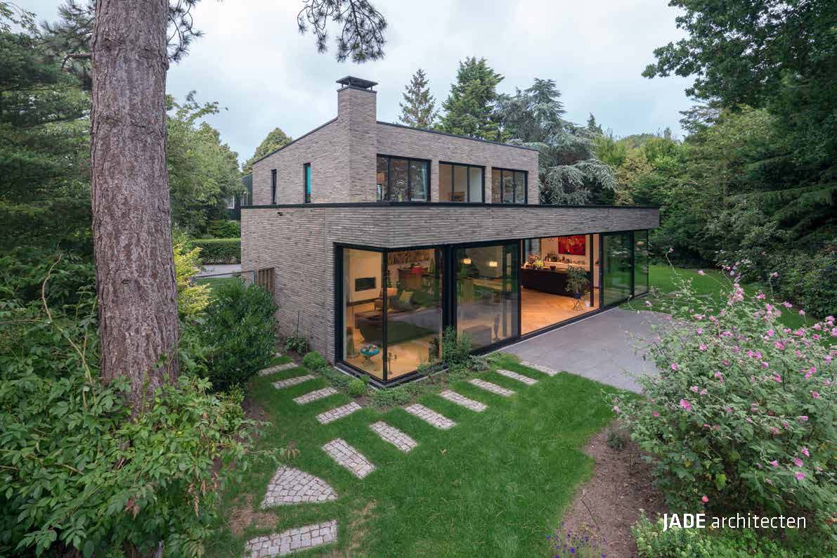JADE architecten chose to transform the villa by using the green-grey facing brick infinitum 6013: “The design and material research resulted in the choice of a brick that embeds the house in its natural green surroundings which change with the weather and the seasons rather than one that would create contrasting façades. In addition, the Hand-Made character of the facing brick ties in with the natural character while the exclusivity of the long format fits the look of a villa.”