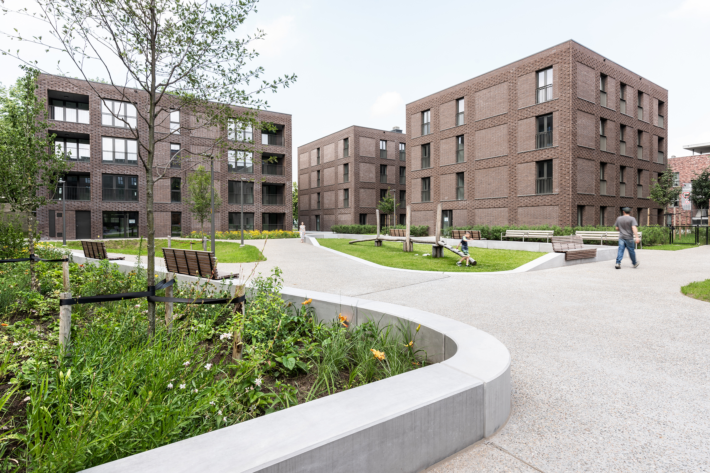 LUCA II is fully committed to social housing. Sustainability, cost efficiency and low maintenance were high on the agenda from the start. The choice of brick as the facing material fits in perfectly with that narrative. Yet it is primarily the special way in which the brickwork has been laid that is going to attract the most attention. All the buildings have been finished using sEptEm 8025, a brown ecological moulded brick which was applied in two formats in order to give the façades extra texture. Recessed brickwork alternates with protruding headers, creating a sort of grid structure that creates a particular articulation. The single massive blocks suddenly acquire more rhythm and dynamism while at the same time, the brick grid structure allows for flexibility and diversity in terms of the plans and interiors. The long six-storey block on Noorderlaan forms a buffer that shields the courtyard, for example. Then on the other sides of the block, a more open development with smaller four-storey volumes has been opted for. To guarantee more privacy, both the ground floor and the courtyard were raised 55 cm above ground level.