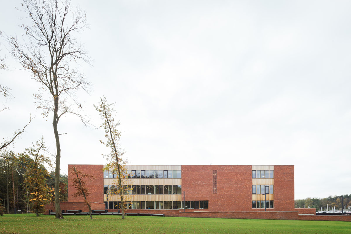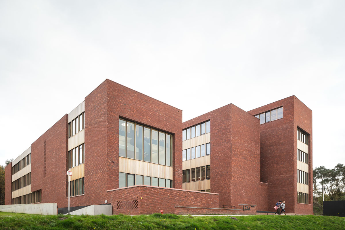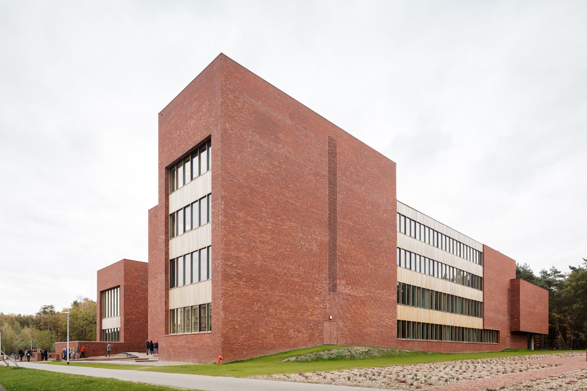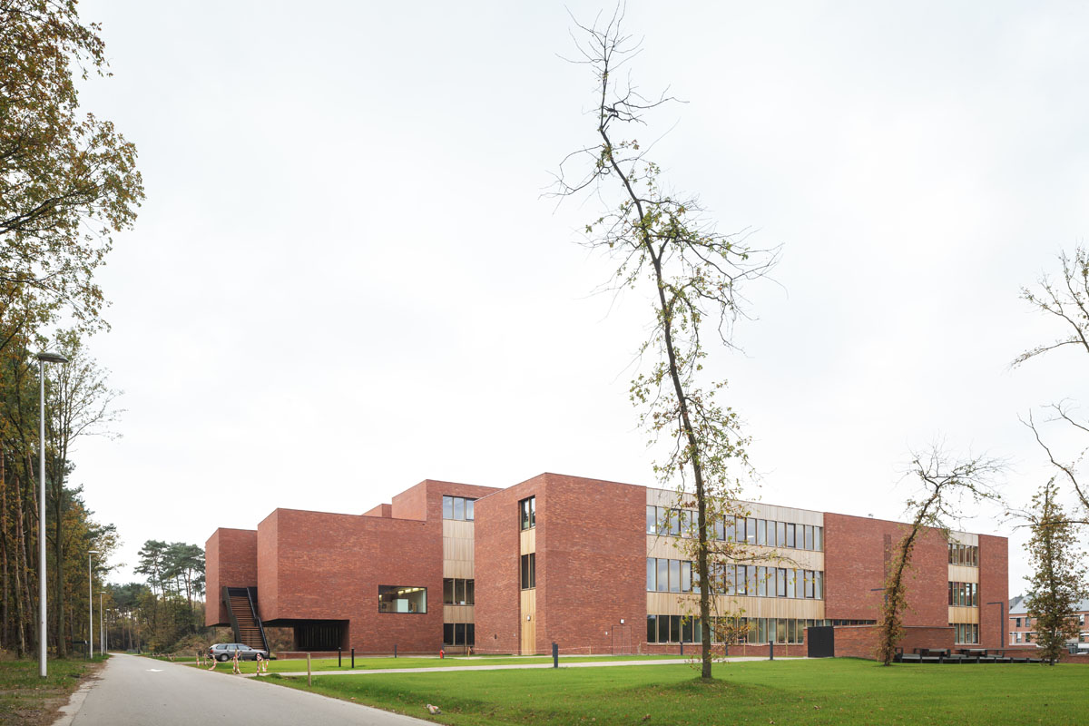 The coniferous woodlands around Genk constitute the characteristic setting for the Sint-Jan campus. The orientation of the three building volumes of the education building has taken this into consideration. The existing, partly sunken parking strip, running parallel to the coniferous woodlands, is considered a structuring element for the site as a whole. The building volumes are situated perpendicular to this strip, thus drawing the landscape onto the site. They are built with Brick K from the Nature7 series. The Hand-Made production process helps give this brick a natural character, so that it blends in perfectly with the surrounding natural landscape.