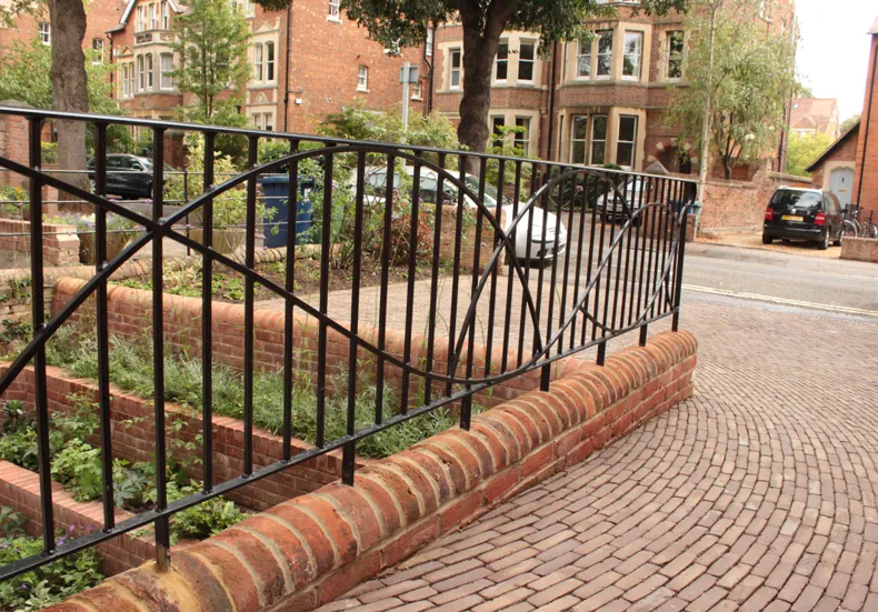 To continue the subtle flow and harmony from the arched door surround and unique iron railing feature, small element clay paving laid in a curving design completed Charlotte's underlying curve-linear design by using Vande Moortel's Ancienne Belgique Camel clay paver, the 185 x 45 x 90mm format size allowing the radial design to be achievable in smaller areas.