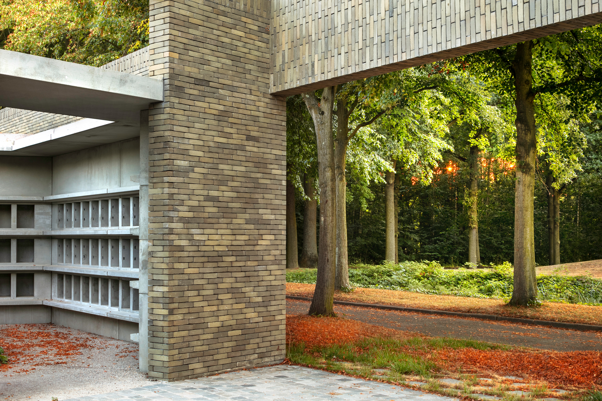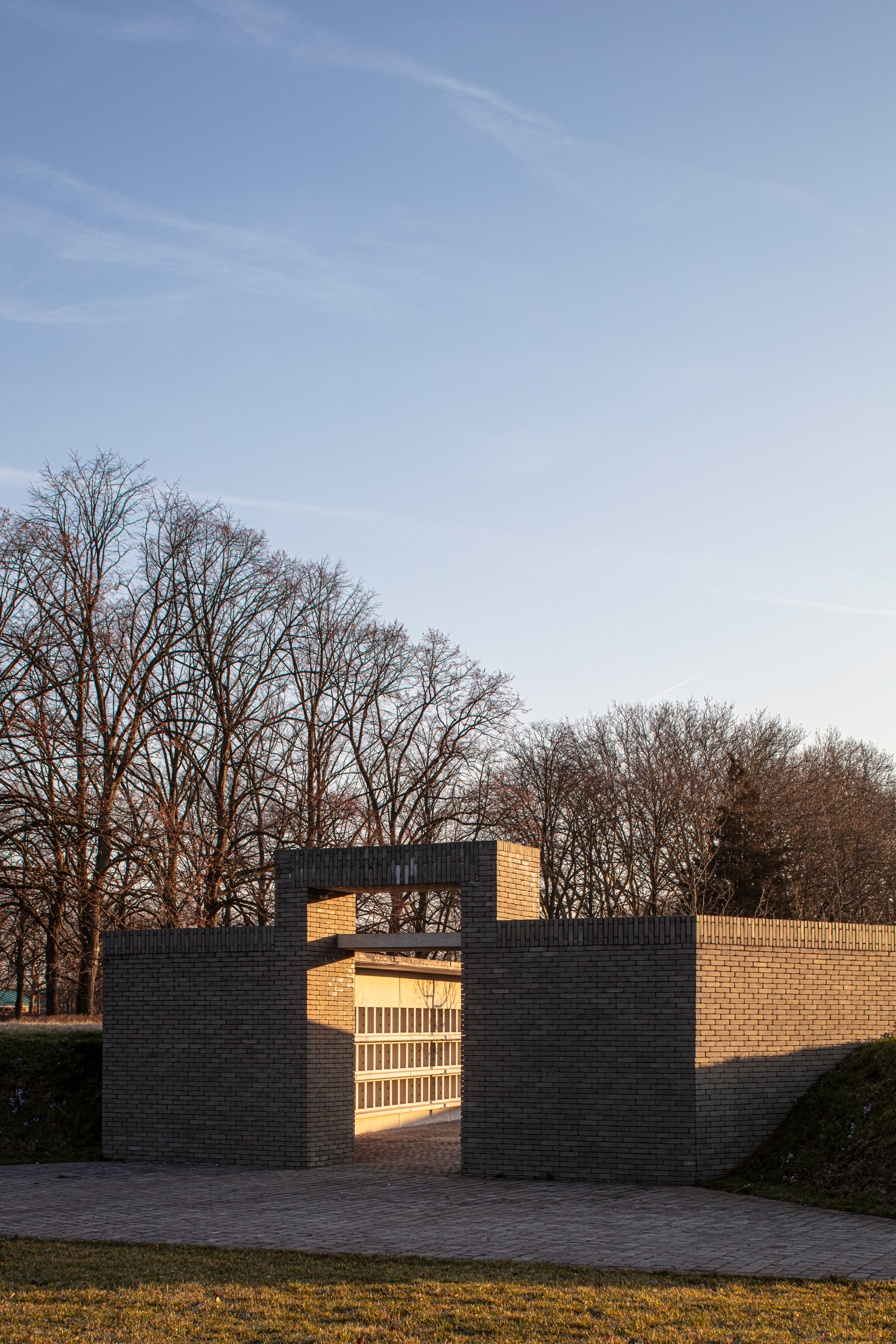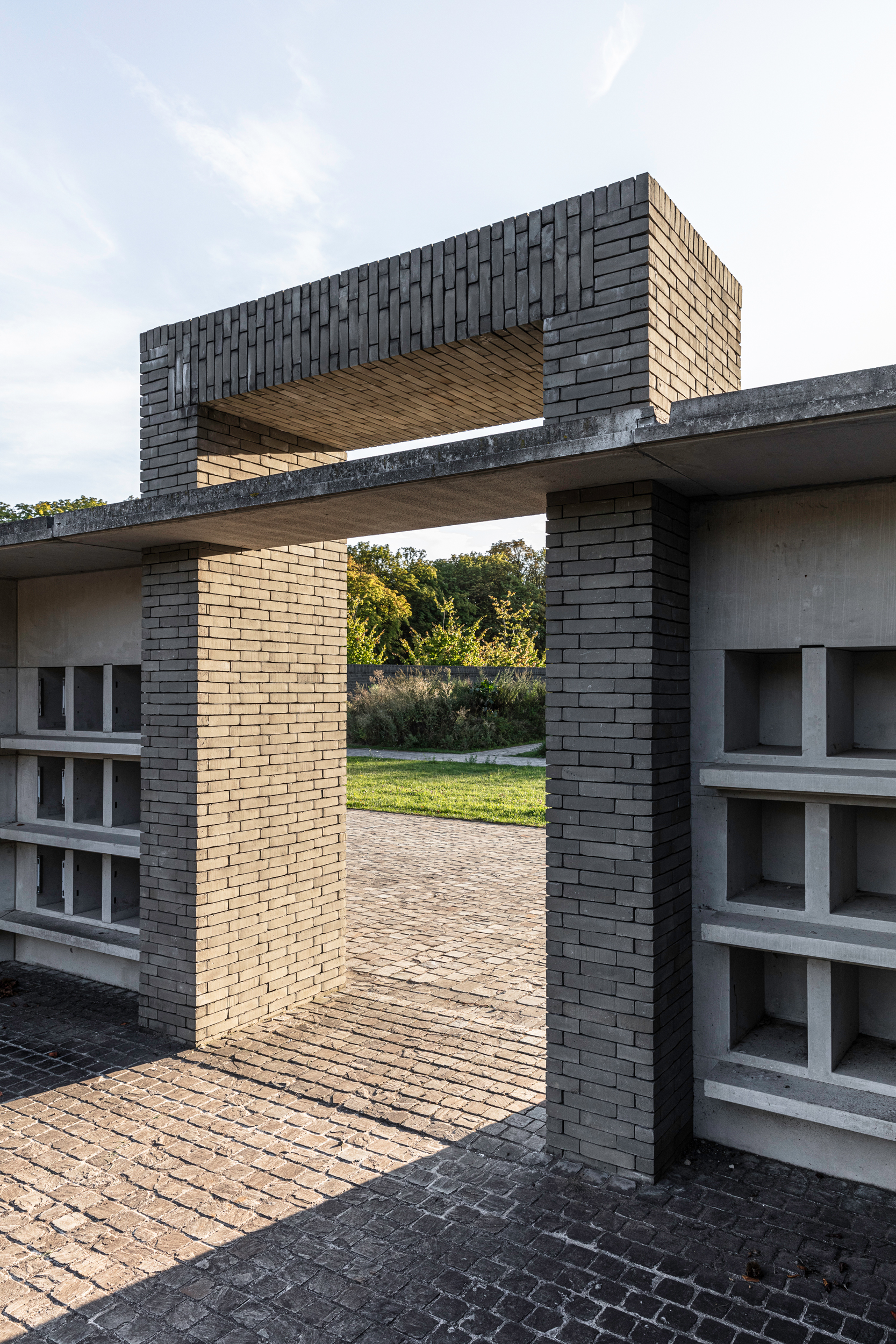 There are also several columbaria in the form of interconnected patios surrounded by wide walls which create a kind of safe cocoon. This gives the visitor the feeling that he is entering a privileged place. The same threshold effect is also created by the succession of concrete or brick lintels above the suggestive doorways. “So choosing the right brick was extremely important. This braised sEptEm moulded brick is a Wasserstrich brick with subtle shading and an ecological format of 7 cm by 21 cm. Its green-grey tint ensures that the structure blends in perfectly with the natural surroundings. Even in spite of the jointless finish and different laying patterns, you still get the impression of a monolithic building. For the long retaining wall, we chose brickwork that contributes towards the function of the building. The relief that is created by the strong variation has made it possible to integrate small nameplates of the deceased very discretely.”