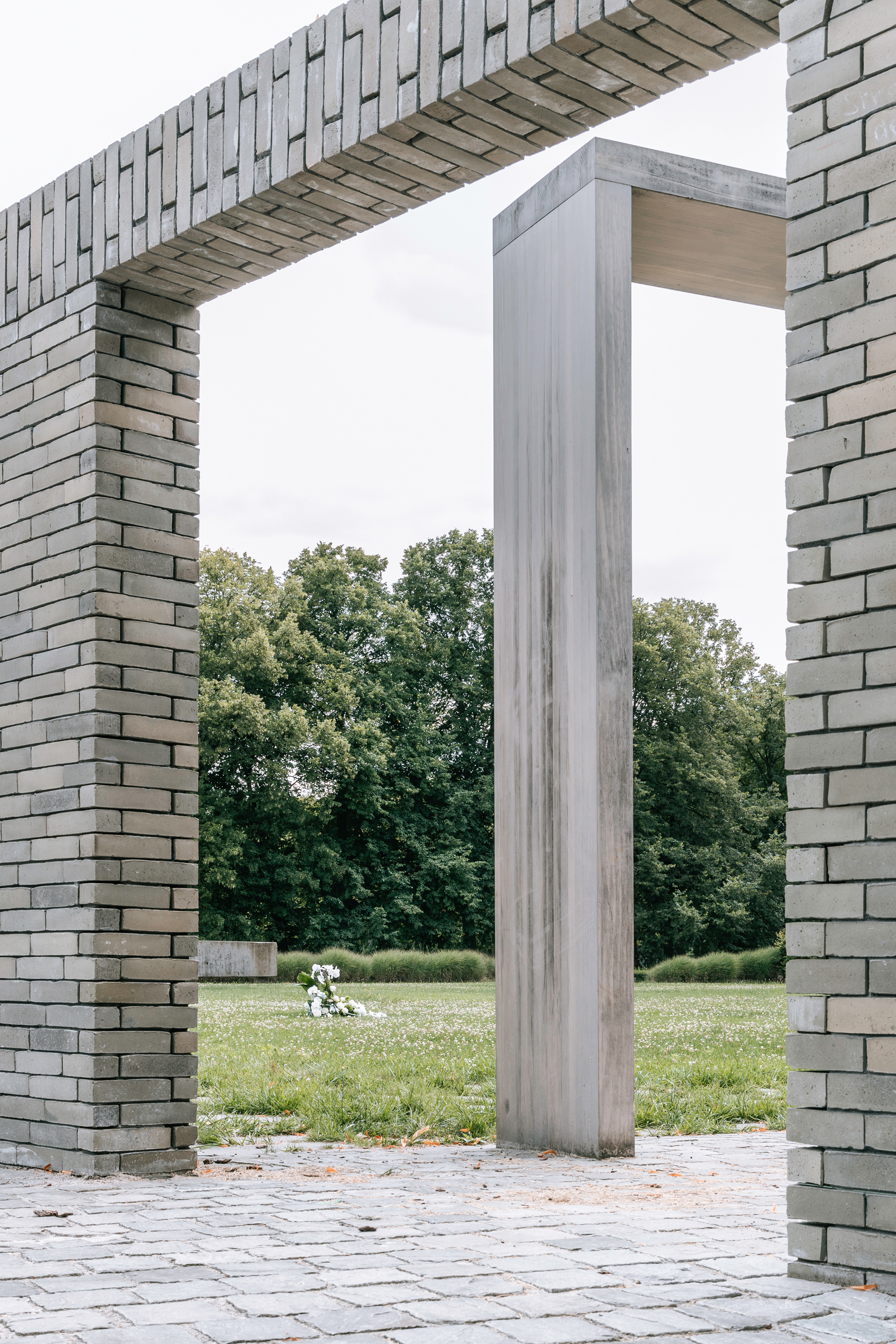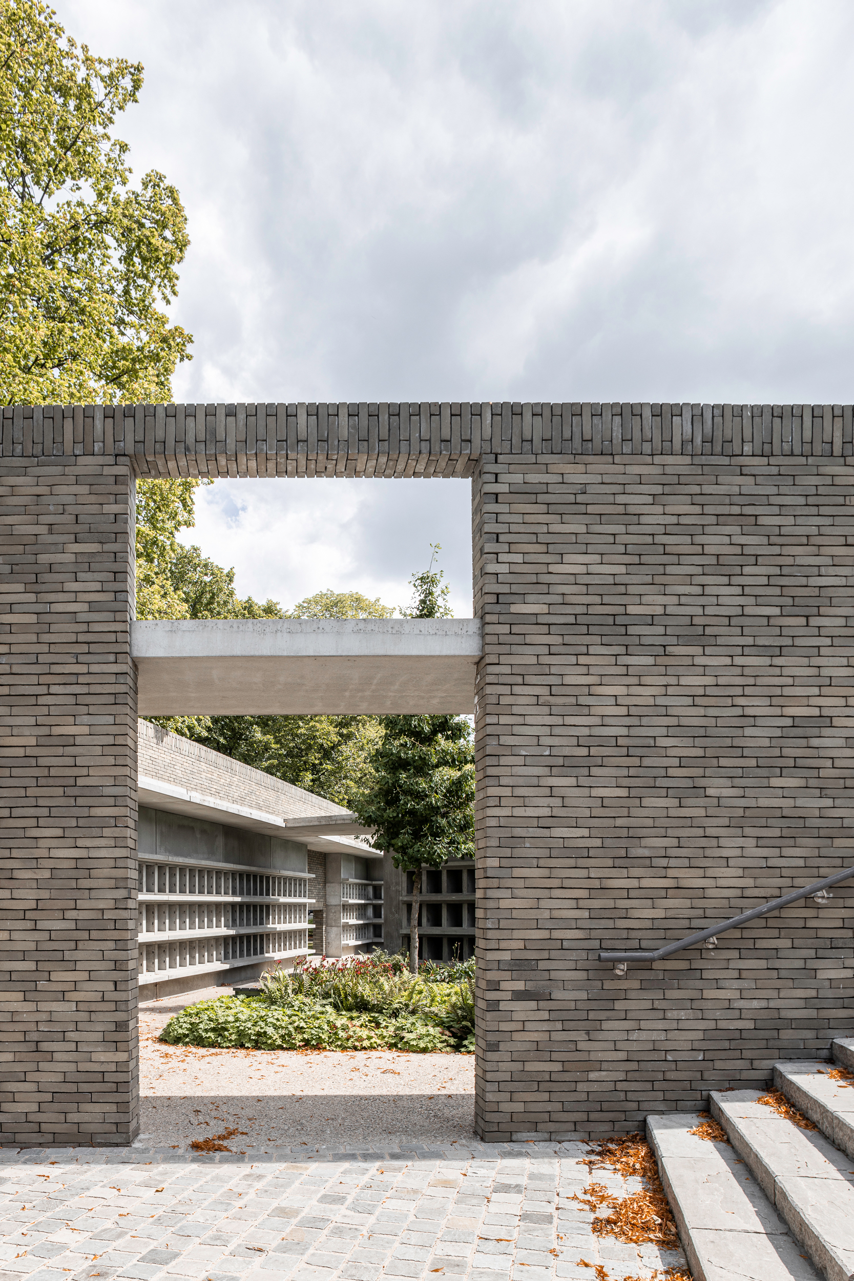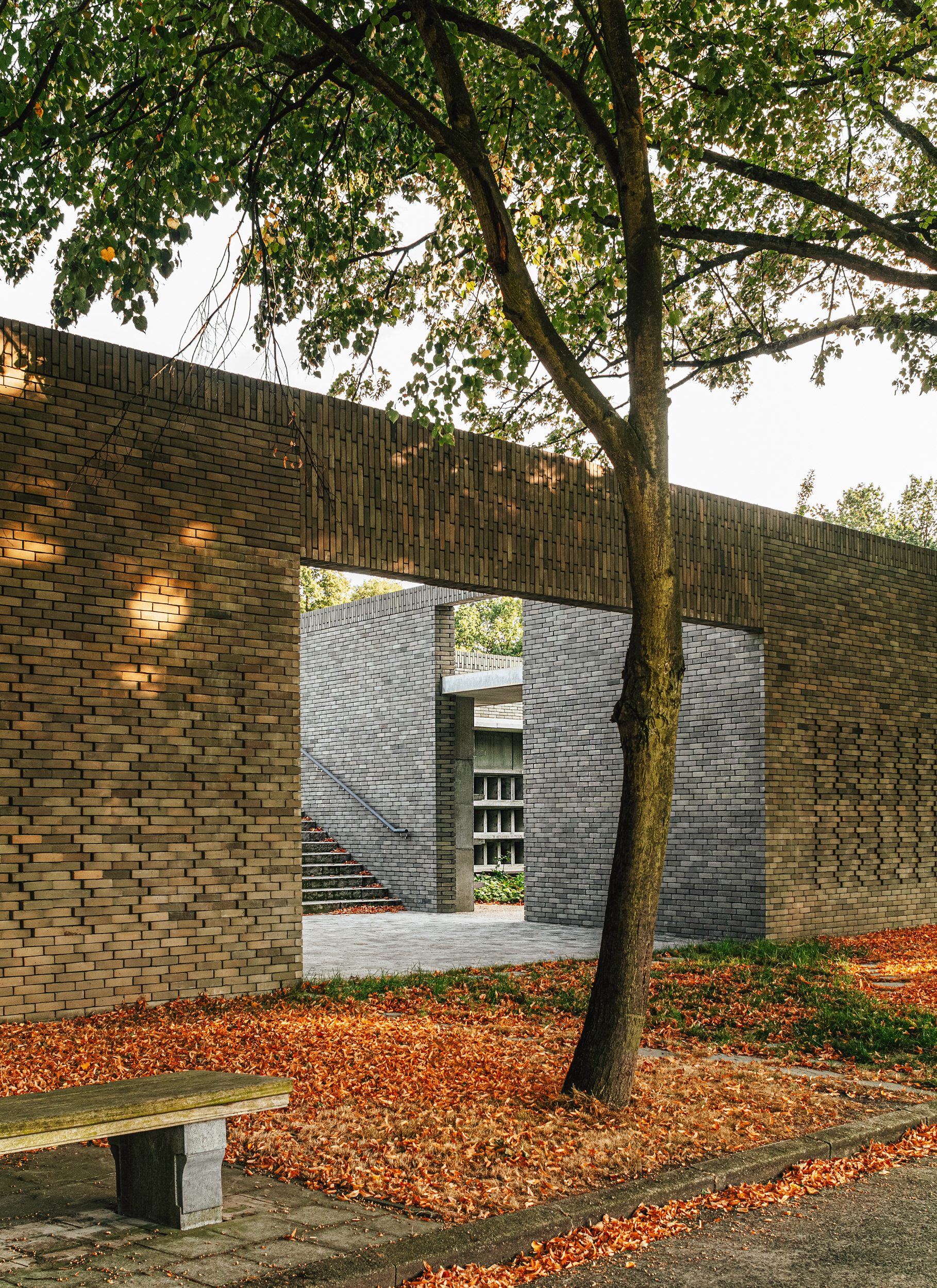 There are also several columbaria in the form of interconnected patios surrounded by wide walls which create a kind of safe cocoon. This gives the visitor the feeling that he is entering a privileged place. The same threshold effect is also created by the succession of concrete or brick lintels above the suggestive doorways. “So choosing the right brick was extremely important. This braised sEptEm moulded brick is a Wasserstrich brick with subtle shading and an ecological format of 7 cm by 21 cm. Its green-grey tint ensures that the structure blends in perfectly with the natural surroundings. Even in spite of the jointless finish and different laying patterns, you still get the impression of a monolithic building. For the long retaining wall, we chose brickwork that contributes towards the function of the building. The relief that is created by the strong variation has made it possible to integrate small nameplates of the deceased very discretely.”