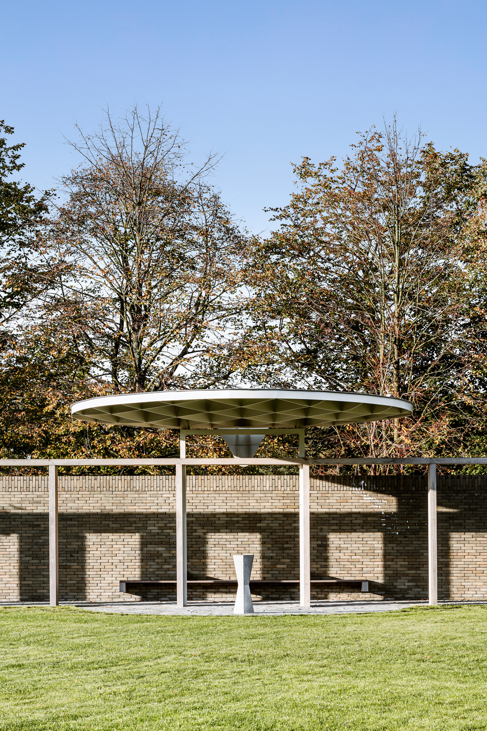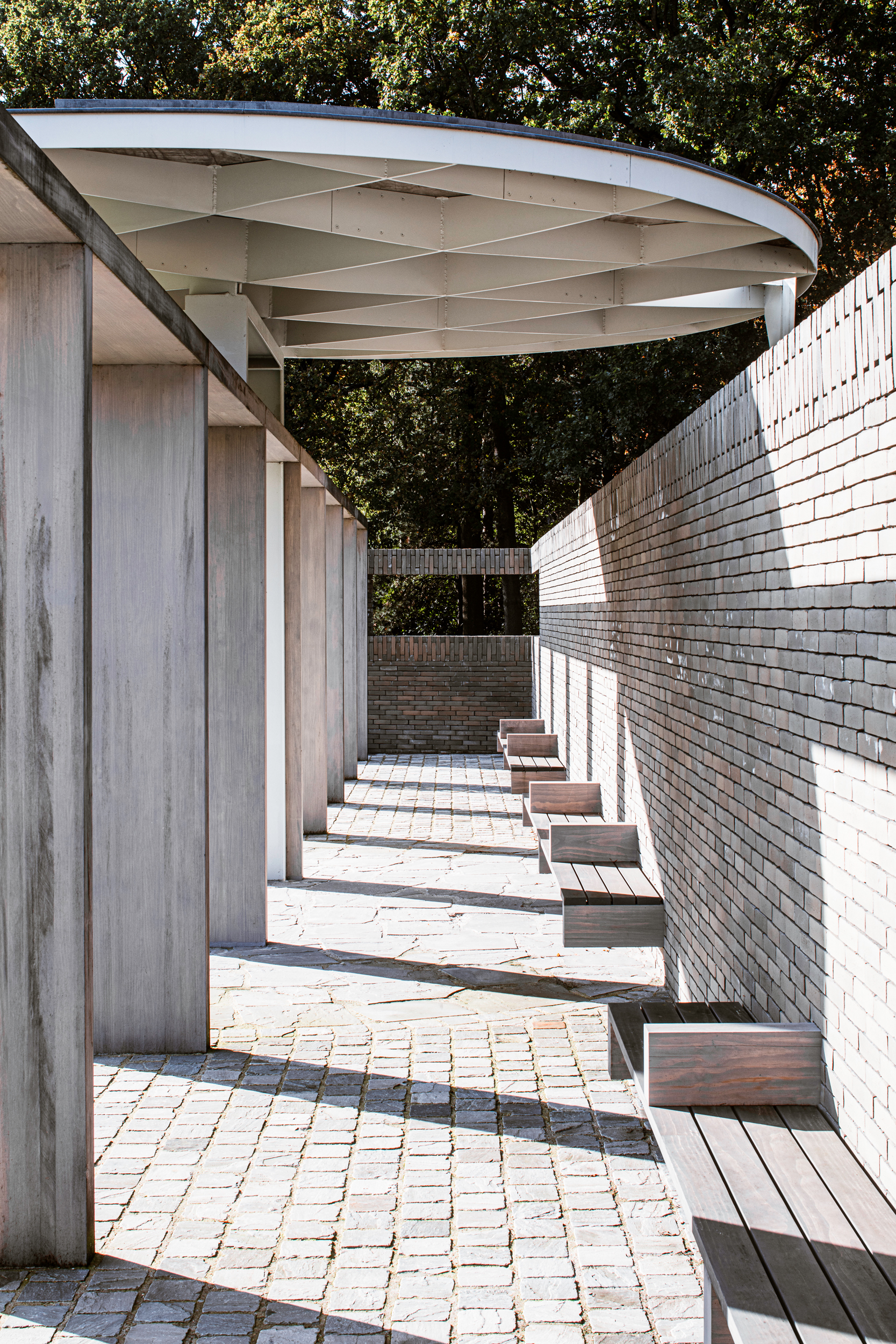 The design for the new area for scattering ashes, that was incorporated by the architects on the existing goosefoot structure, encompasses 4 scattering meadows, urn graves and 3 columbariums located between the chateau and the crematorium. Central to the design is the ceremony area, marked by a distinctive egg-shaped canopy. It towers atop a series of wooden porticoes and in front of a long brick wall along which wooden benches were integrated. From there, you get a beautifully framed view of the surroundings through the open colonnade.