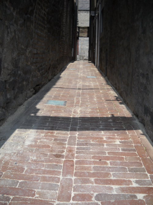 Anti-parking poles separate the pedestrian zone from the street. What used to look grey and sombre now looks rather colourful, even quite Provençal, thanks to the lovely warm clay pavers. The architects decided on a Decima Mahonie, a full unsanded, tumbled clay paver.