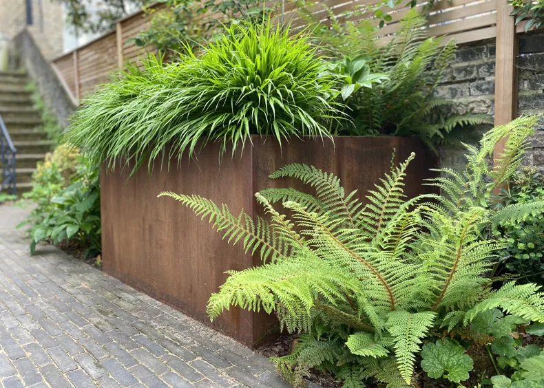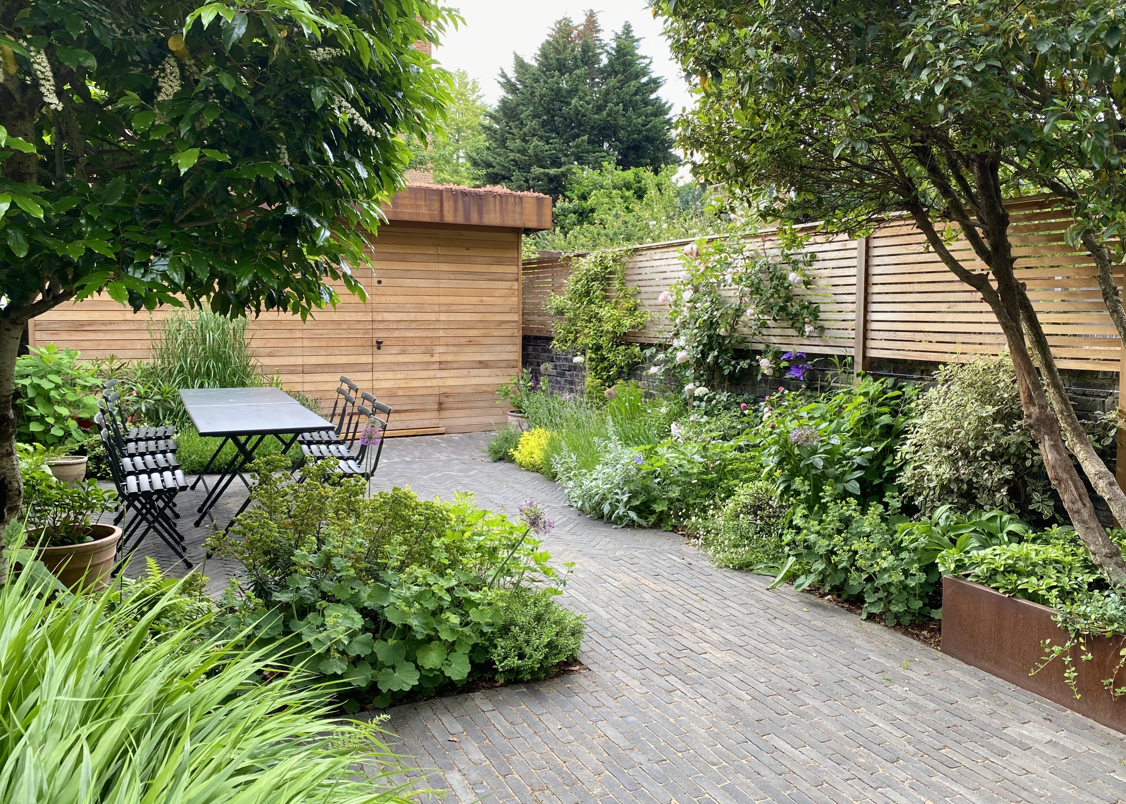The mature trees on site were retained, with existing dated brick planters replaced by contemporary corten steel. Corten was also used to trim the green roof on the new bespoke cedar clad storage shed, with cedar slatted trellis along the garden walls to improve privacy. The mixed planting scheme adds texture and colour and helps soften the space.