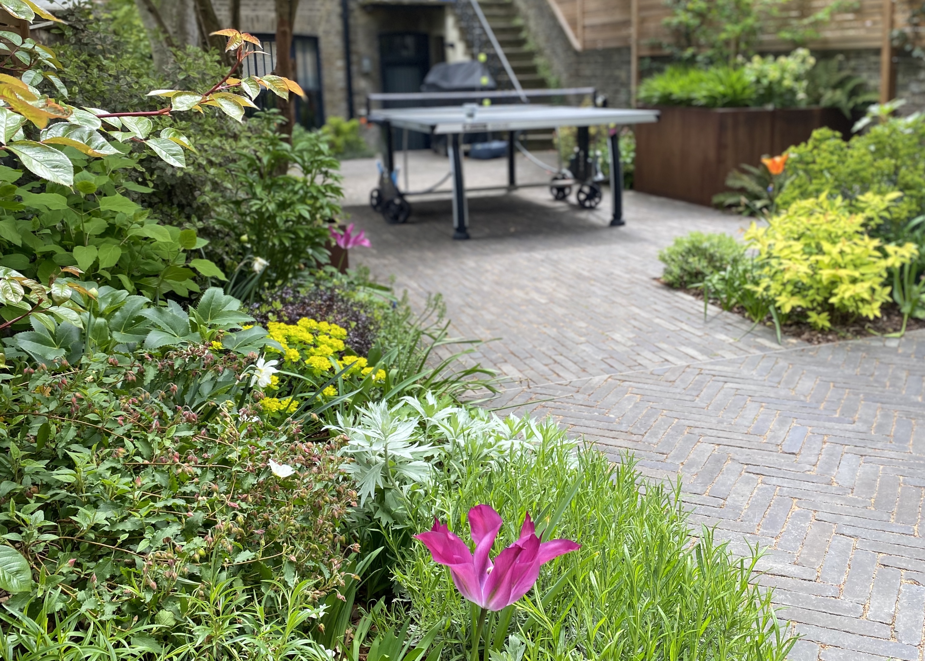 Vande Moortel Clay pavers SeptimA Taupe were used in different patterns in the courtyard spaces which could be used flexibly for eating out or lounging. One of the spaces was enlarged from the original design to accommodate the family’s full size table tennis table, a vital diversion during lockdown. New steps and terraced planting also improved the view from the basement flat.