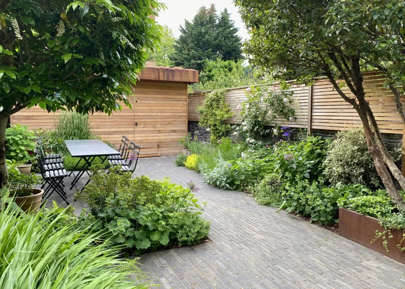 The clay pavers added a contemporary feel, working well with the corten steel planters and were the perfect choice to complement the clients' house with its dark grey paintwork. The garden was used extensively during lockdown and as things opened up became more of a sociable space for family and friends.”
