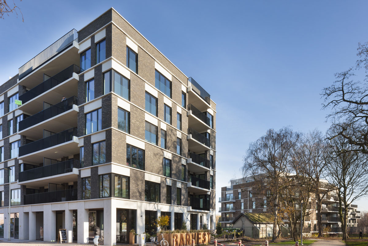 Via a meticulous choice of materials and a number of visual variations in shade, each volume has been given its own unique identity that makes the most of its exact location at the site. The gatehouse in front responds to the more urban context. It serves as a landmark with its public-oriented base, seven floors, internal terraces and the black-grey shade of the brickwork.