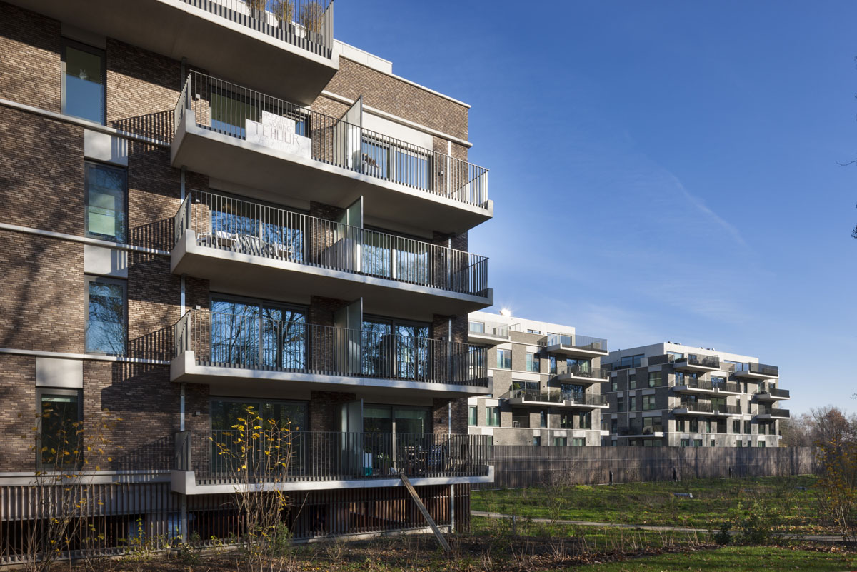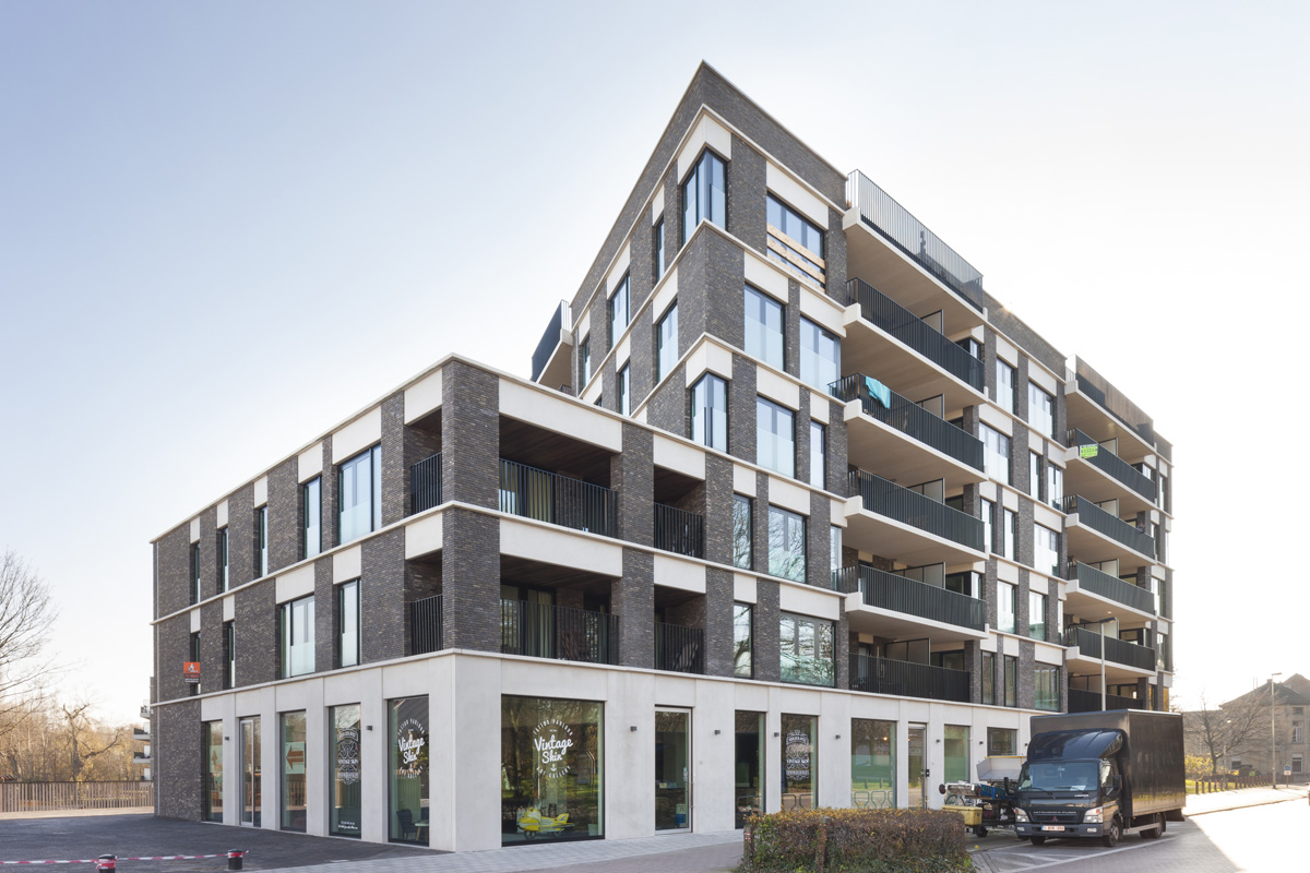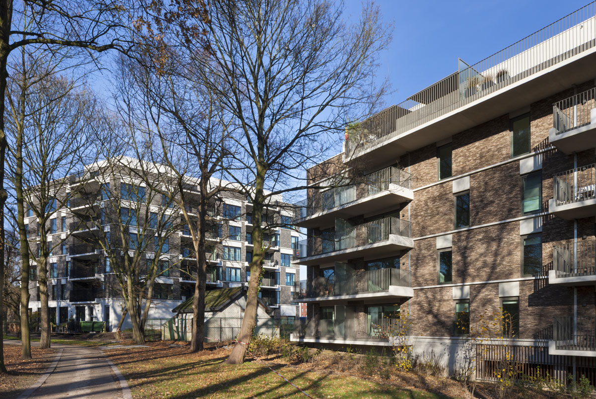 They are interconnected by a wide footpath created using anthracite-coloured clay pavers from Vande Moortel, with a spacious underground car park underneath. The outside space has been interpreted as a park, ensuring that the project blends in seamlessly with the surrounding ramparts.