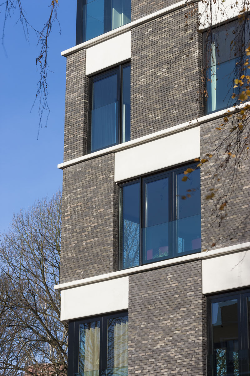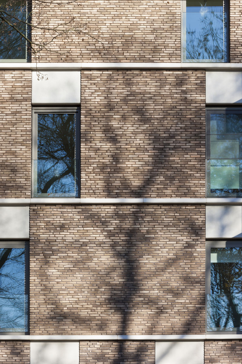 The four volumes speak the same architectural language and form a coherent whole. A central thread that runs through the whole project is the way that floors have been accentuated using architectural concrete and a rhythm has been created by changing patterns in the brickwork and terraces.