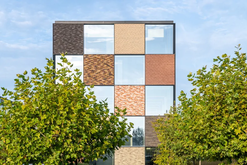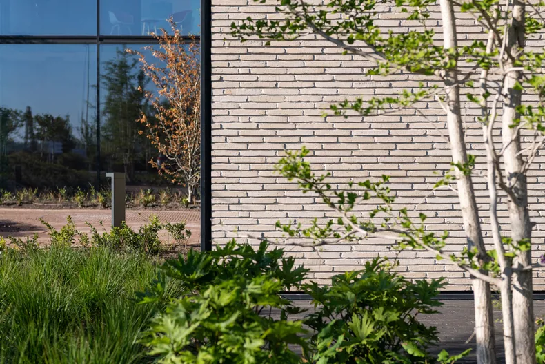 At the beginning of 2020, Brickworks Vande Moortel moved into a brand new, multifunctional building along the Scheldt in Oudenaarde. With this unique building comes an equally important outside space which comprises four main functions: a permanently accessible display park, a route guiding visitors to the entrance, adequate parking and the busy access road leading to and from the storage area at the rear.