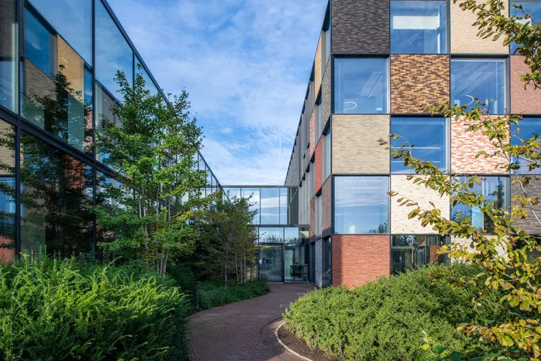 The outside space also excels in terms of its climate-proof design, with various ecological features such as water-permeable surfaces, rainwater attenuation in swales, softening with plentiful greenery and biodiversity and the use of circular materials.