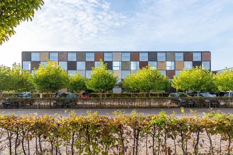 The rhythm of the façade with its chequerboard motif is reflected in the show park via a mosaic of lawns and greenery. Consequently, no less than half of this total area consists of unpaved ground. This means that the rainwater has more than enough space to infiltrate into the subsoil.