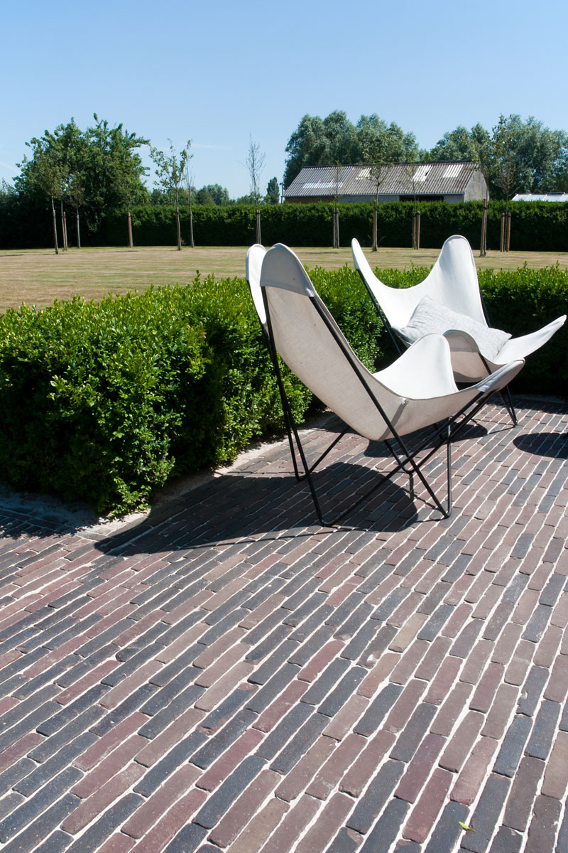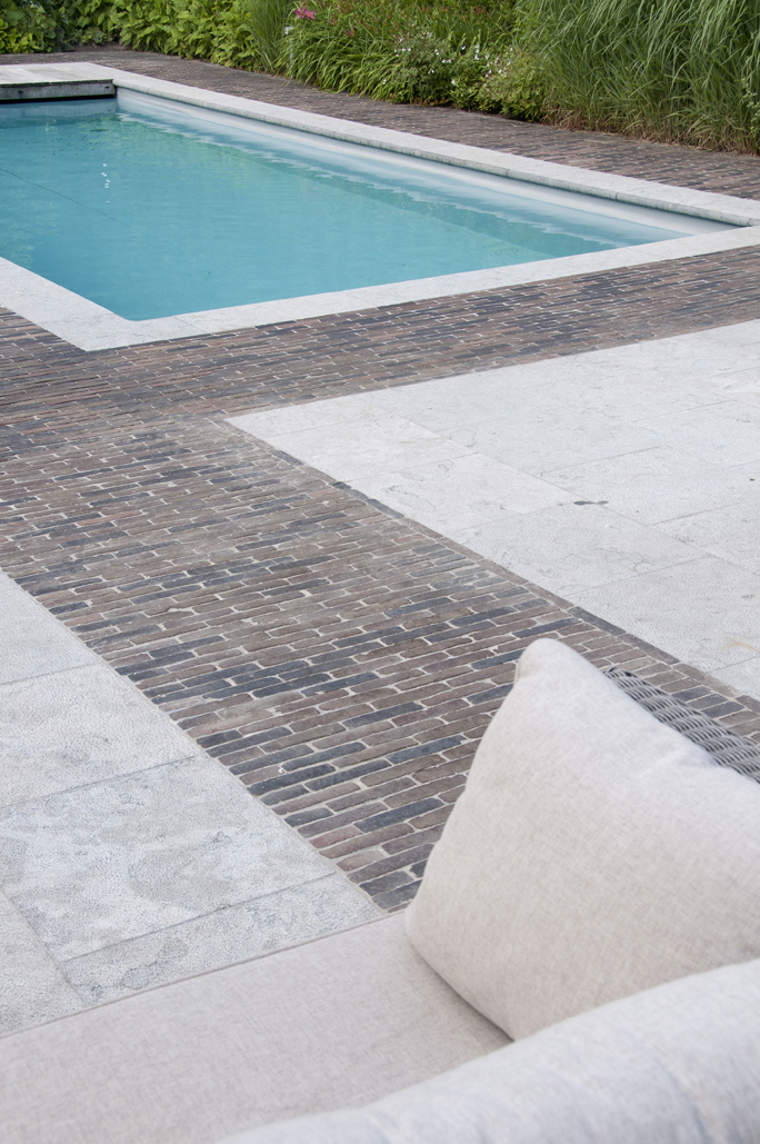 The clay pavers are placed loose against each other with a minimum joint (2 to 3 mm) by means of the click & drop method. By first tapping the pavers together and then lowering them onto the paving layer, the correct joint thickness is automatically achieved and the paving layer remains untouched. If necessary, a slightly wider joint can be used from time to time in order to maintain the bond. Laying the clay pavers so that they are pressed against each other is strongly advised against in order to avoid edge damage.