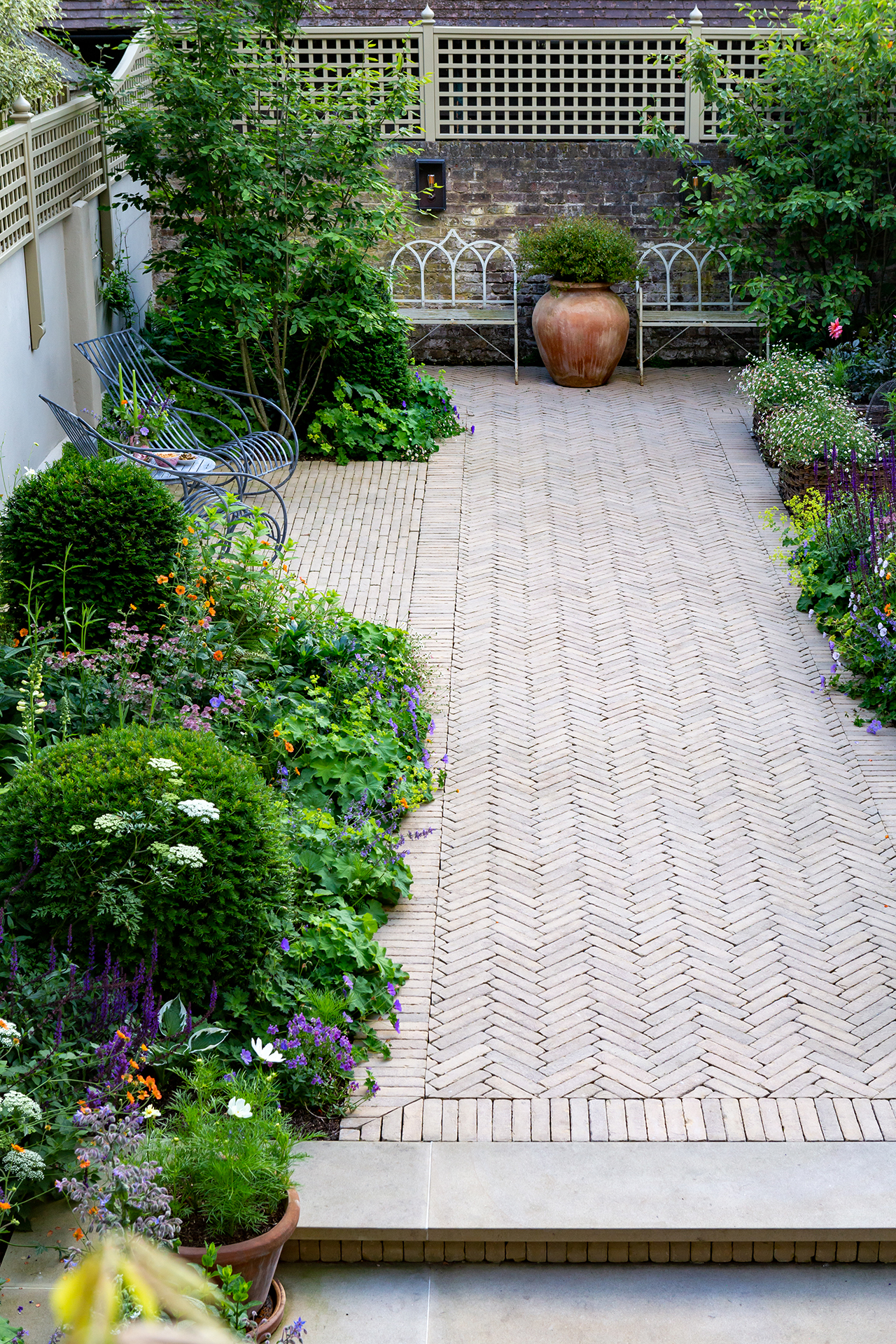The pavers are laid on edge, always with the sanded side laid against the non-sanded side. Drummed clay pavers are to be laid with the least damaged stretcher side facing upwards.